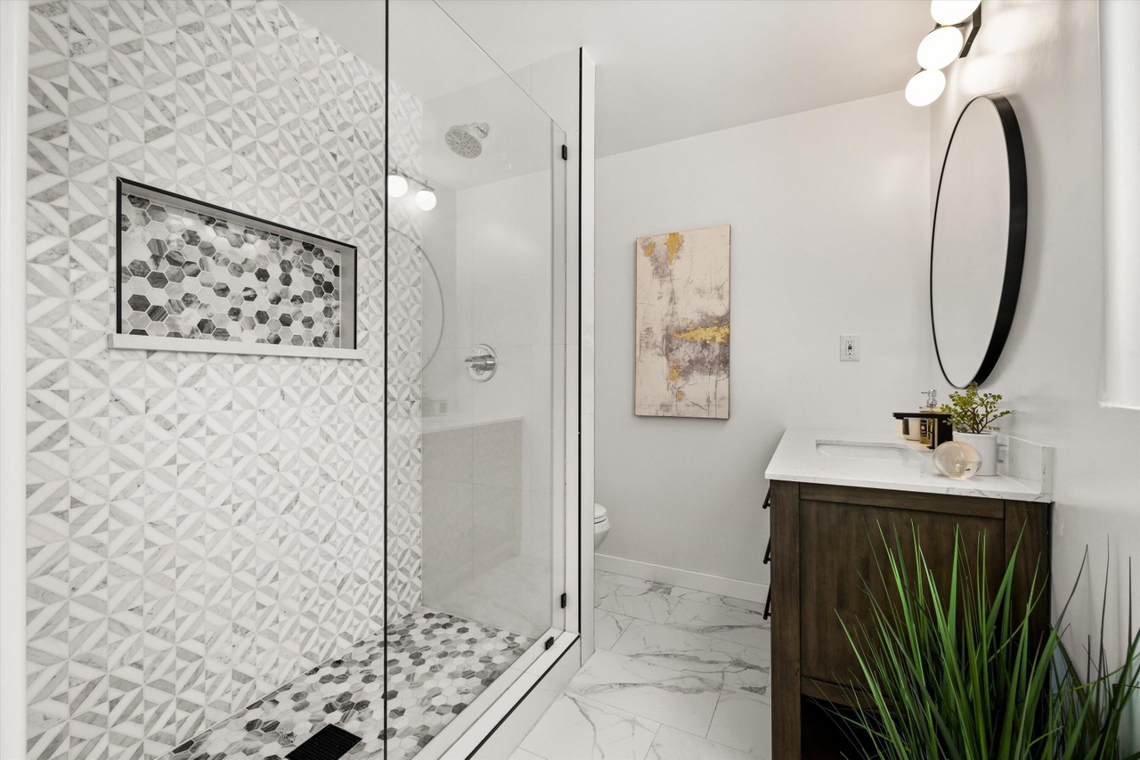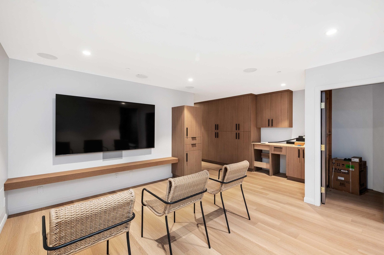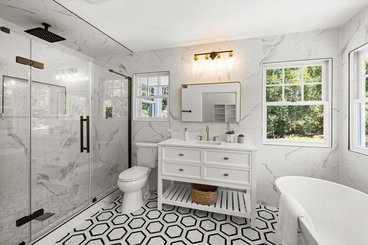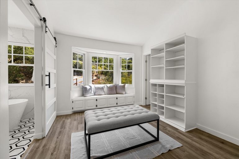 At 505 Mountain Drive ($3.3 million), which the seller bought it in February for $2.15 million, the weird-shape problem mentioned above shows up in the primary bedroom, and the design choices are a bit aggressive, with high-gloss ceilings and clashing bathroom tiles. As with any spec reno (which I’m guessing this is), you have to be on the lookout for value engineering. Why aren’t there more shelves in the large primary closet? What happened to the deck around the hot tub? It looks like Lisa Simpson’s hair.
