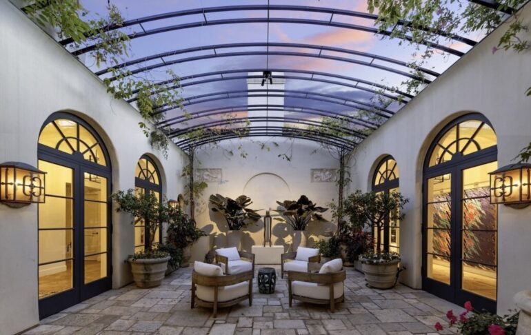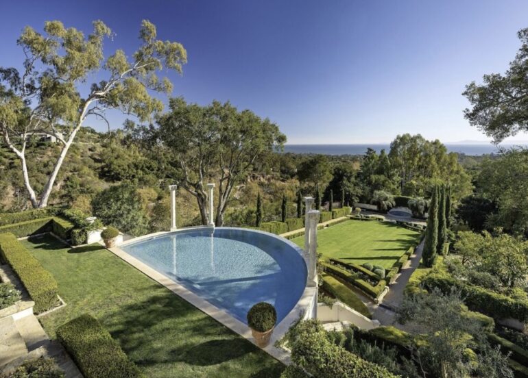 At 272 El Cielito Road ($8.35 million), a 2013 Mediterranean tucked against W. Mountain Drive, the pool is the star: south-facing, with open sky above and an ocean view. The house itself—three bedrooms, five and a half baths—could use a good zhush. I’m no stickler for keeping to one style, but the concrete floor in a guest room (?) feels at odds with the rest.
