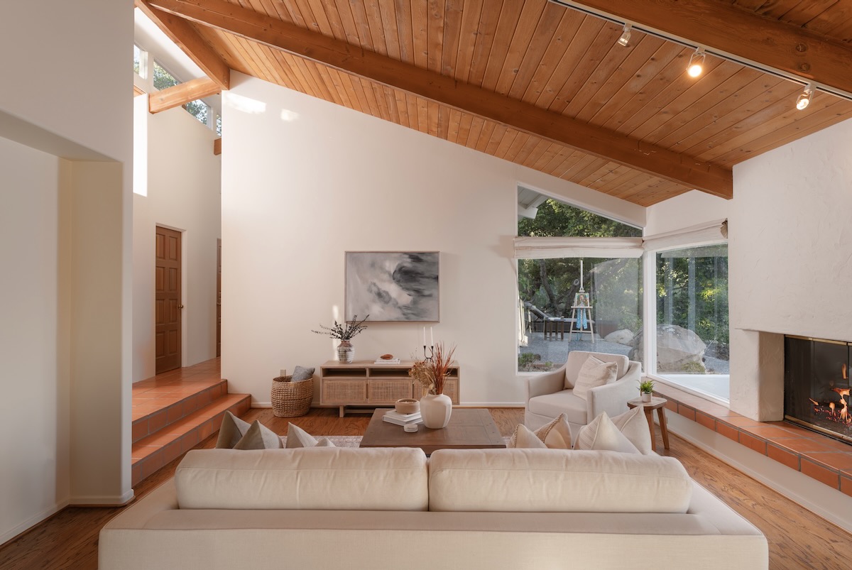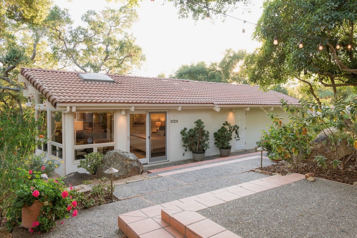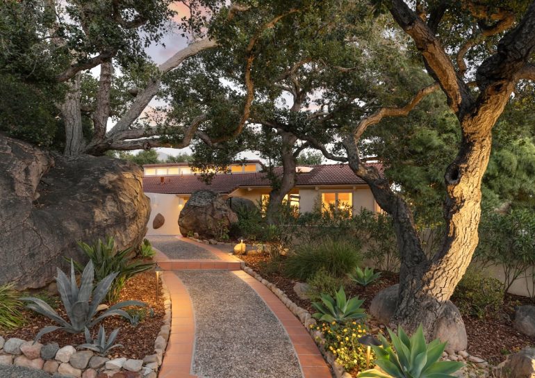 The entrance to 30 Fairwood Lane ($2.995 million)—at the end of a Cielito cul-de-sac—is wildly dramatic, via a path that winds amid boulders and oaks. (Love the rock embedded in the wall by the front door.) The house was built in 1968, but the architecture feels 1970s, with sloped ceilings, trapezoidal clerestory windows, and little sets of steps. Unless you like someone else’s carpet in your bathroom, you’re going to need to swap out some surfaces. While the work gets done, you can always hang out in the sweet guest house or at one of the many seating areas out back, facing a greenbelt. P.S. That’s a garden of raised beds.