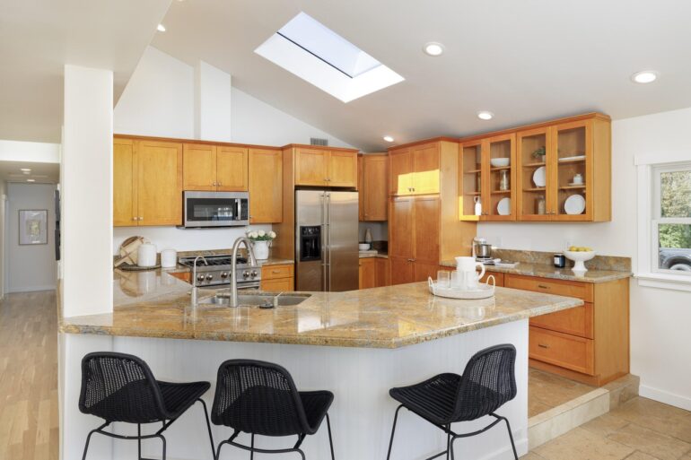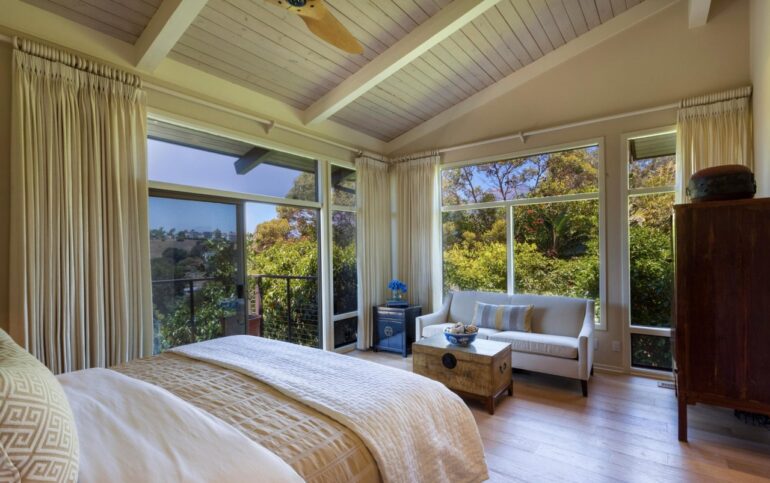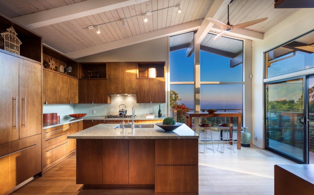 The split-level 1977 house at 2031 Cielito Lane ($4.45 million) has a lot going on—so many stairs and levels and angles and windows and skylights—but it feels neatly embedded in the landscape.