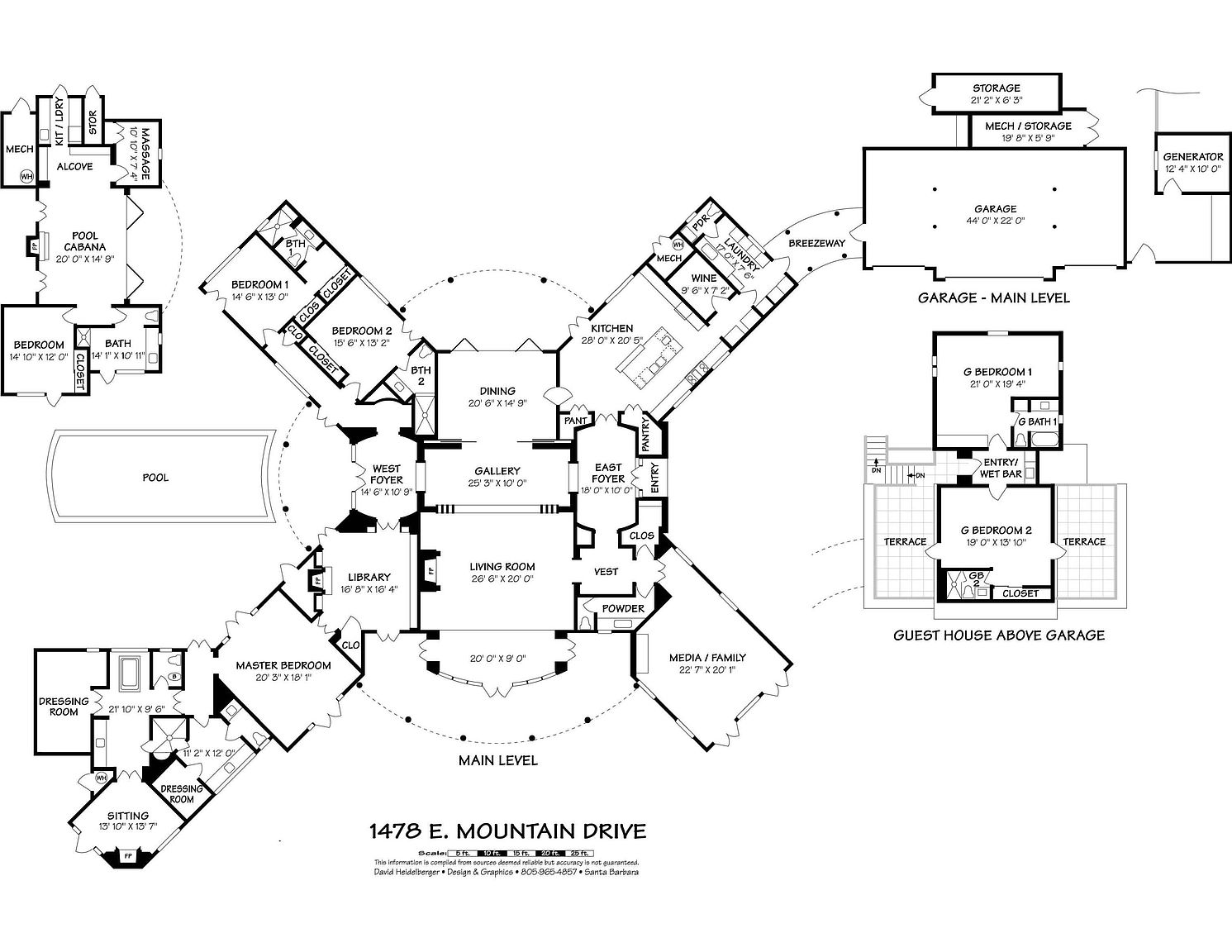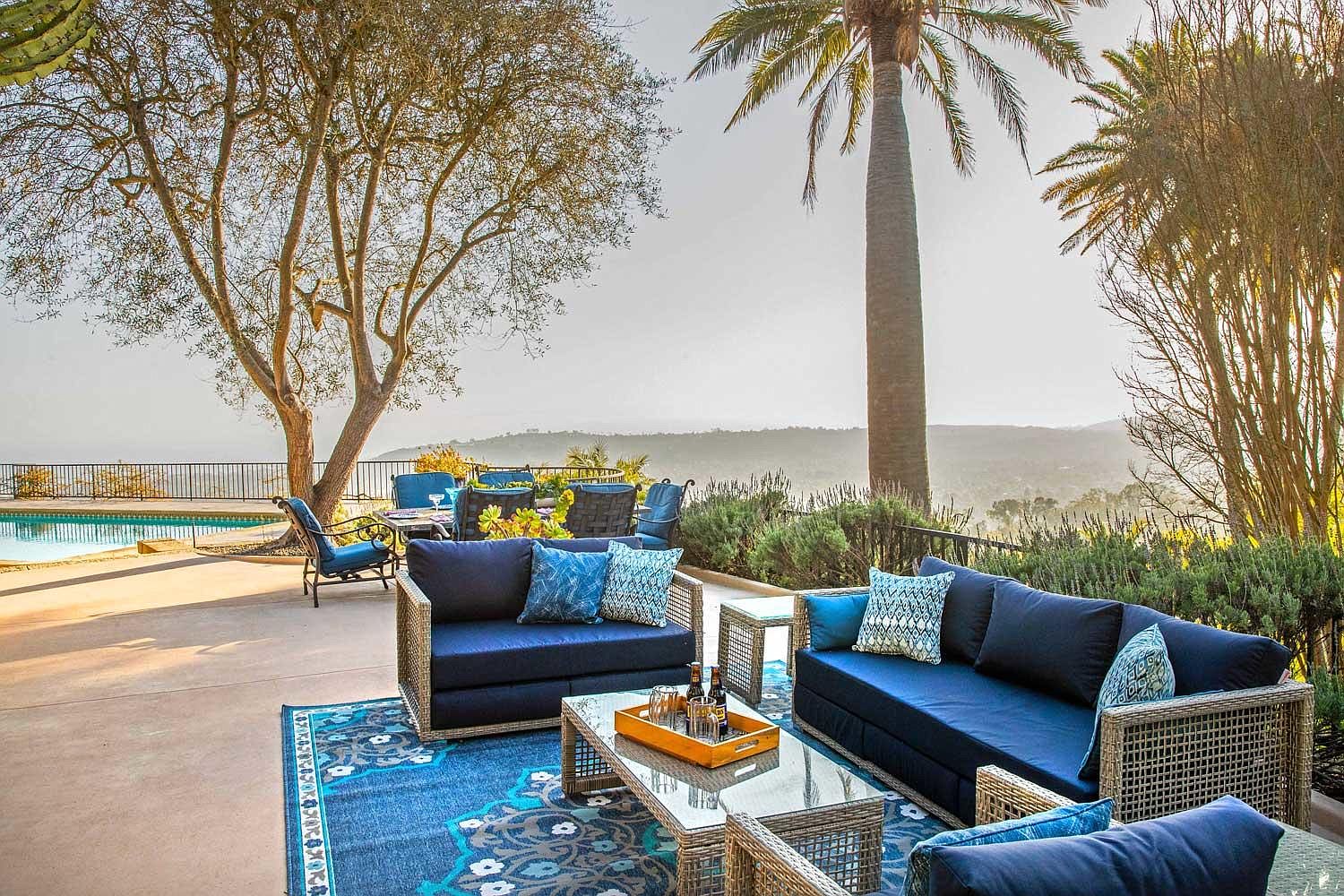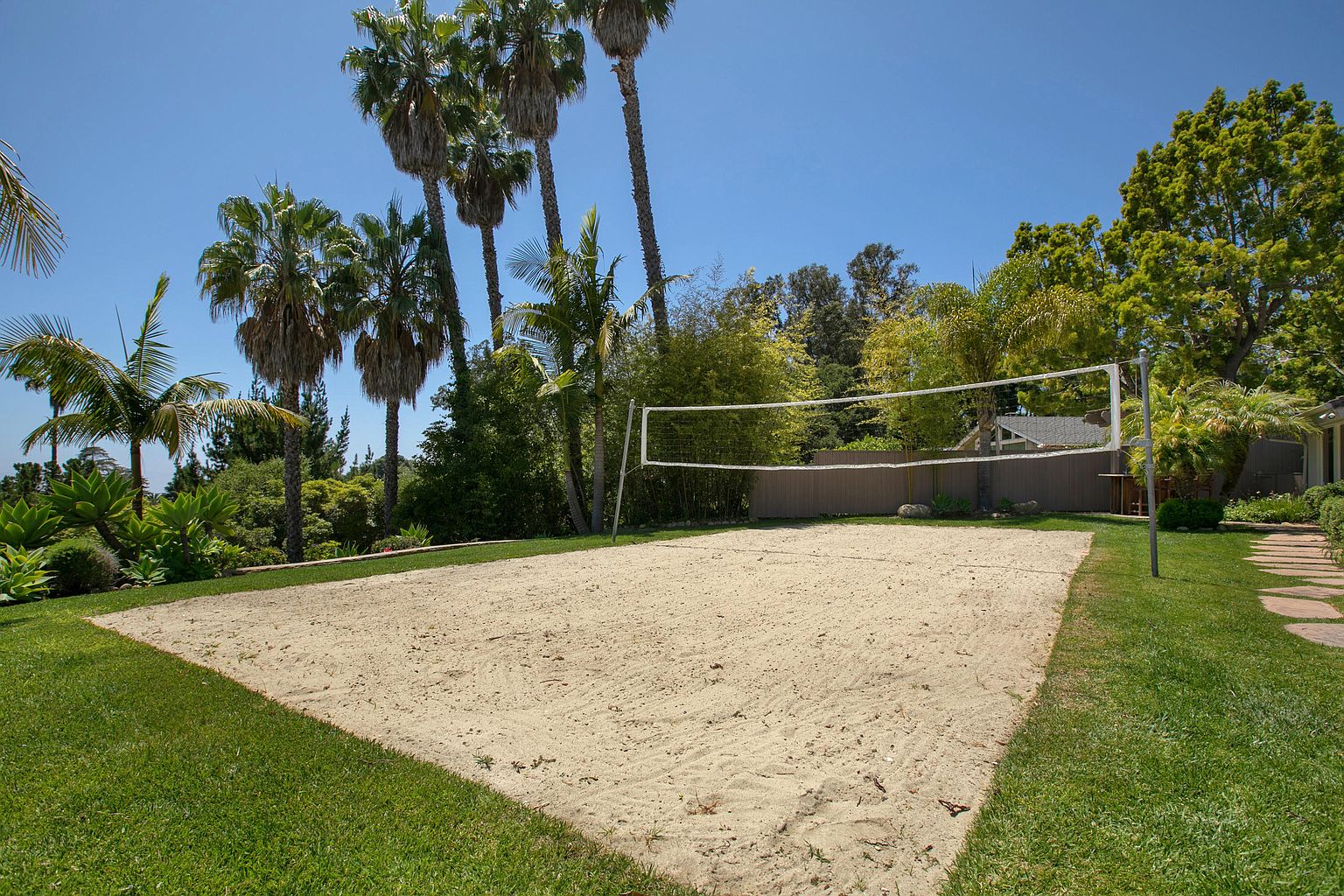The house at 875 Woodland Drive ($2.885 million), on Eucalyptus Hill, is nothing to write home about, but you could throw a heck of a party there. Note the beach volleyball court, grotto pool, alfresco bar, viewing pavilion, small putting green, and “surf shack”….