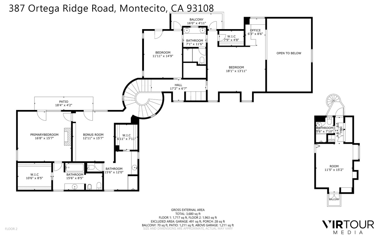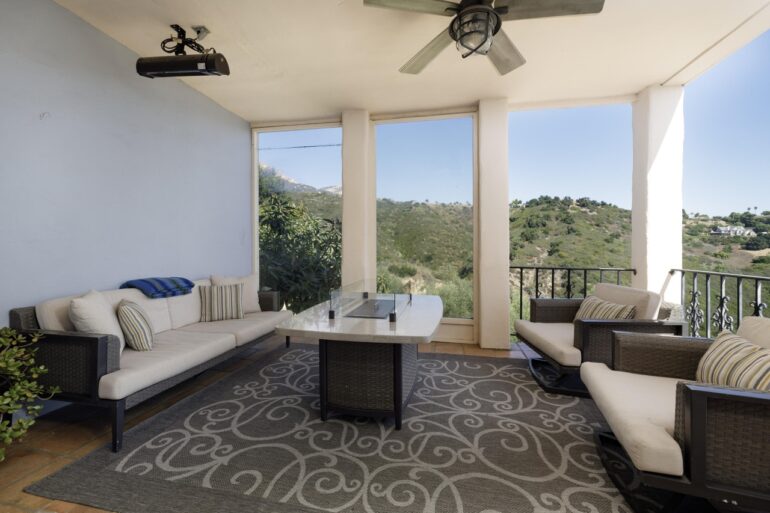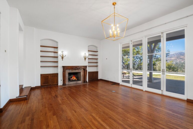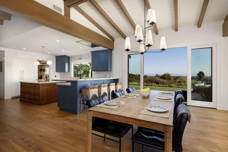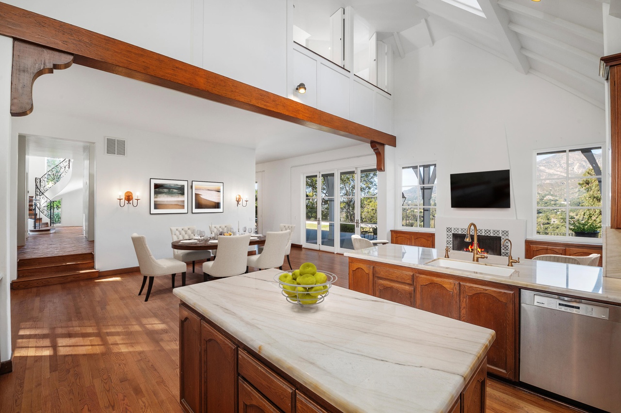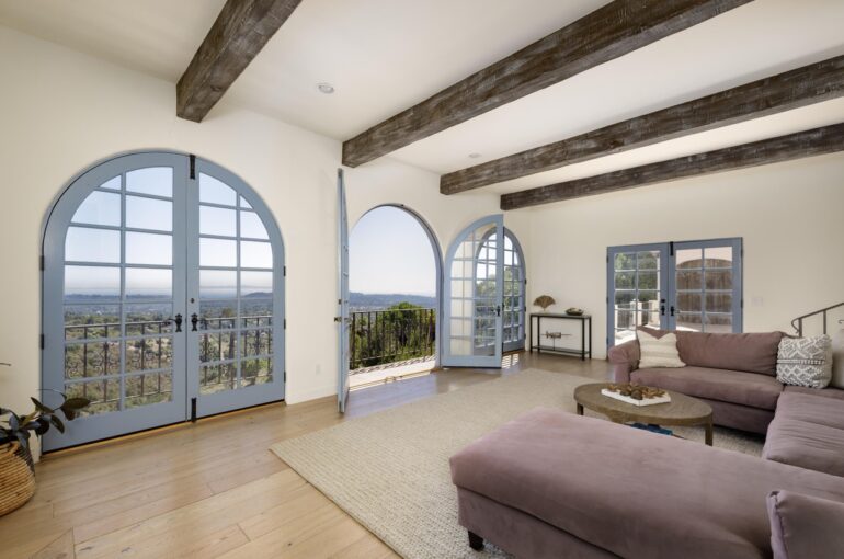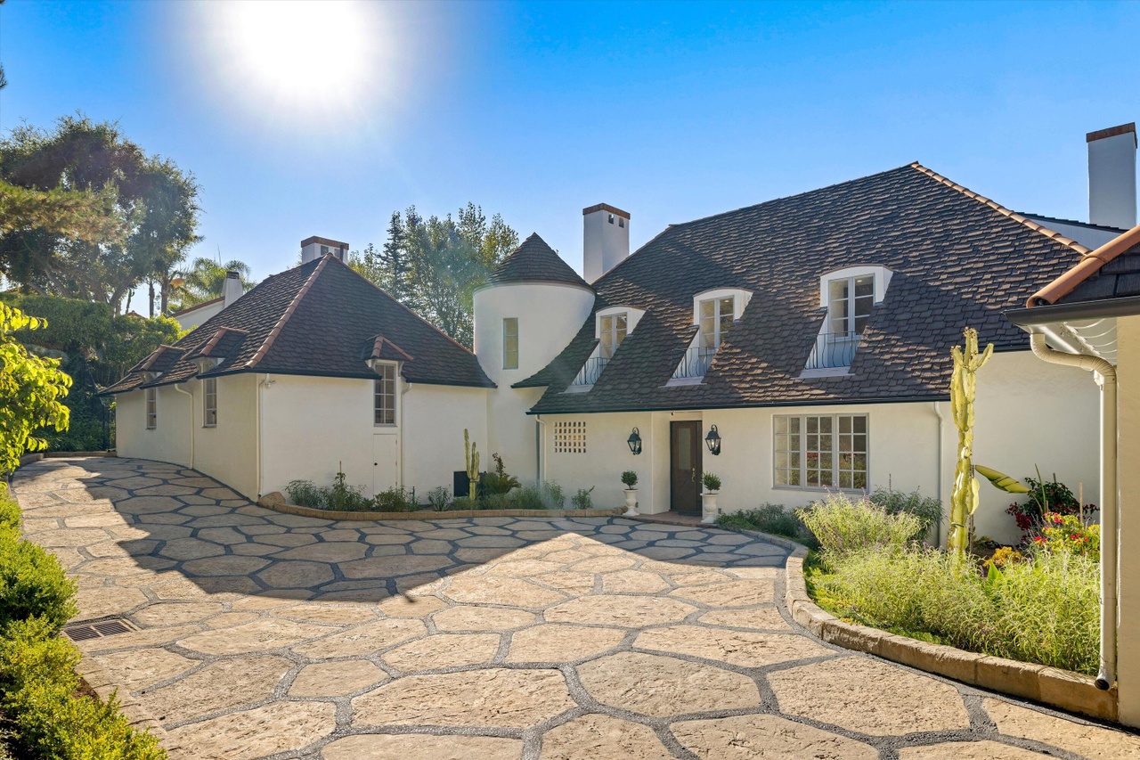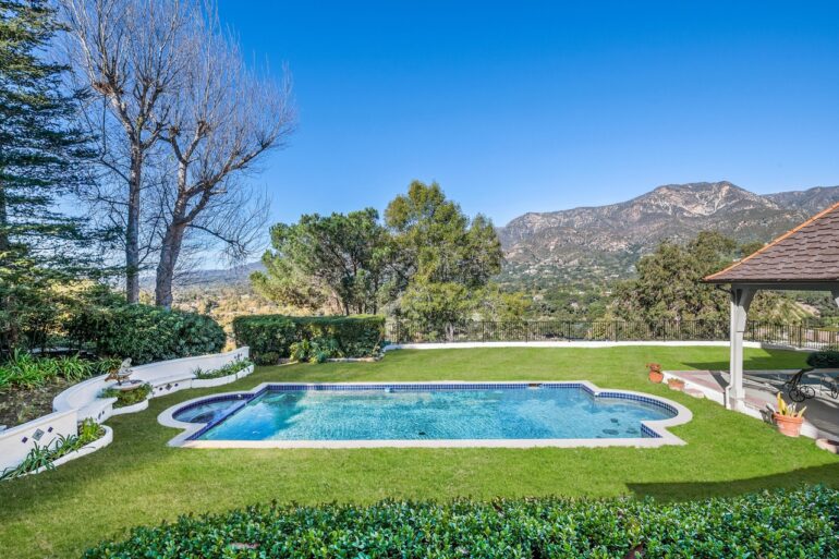 it took a certain kind of vision to stand on the west side of Ortega Ridge Road, with that classic view of Montecito and the mountains, and see the need for a miniature French Norman chateau. Interesting choices continue inside 387 Ortega Ridge Road ($5.795 million), built in 1988: the primary is one of two en suite bedrooms, laid out railroad-style; Saltillo tile in a French house; an interior window looking down to the kitchen…. The pool is charming, though, and there’s a small guest room over the garage.