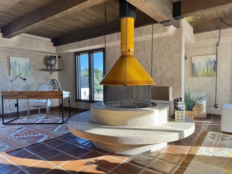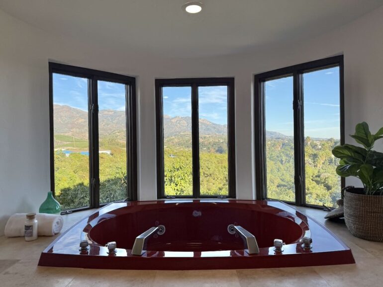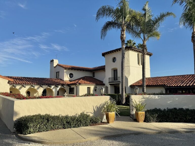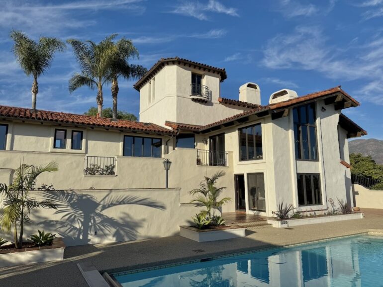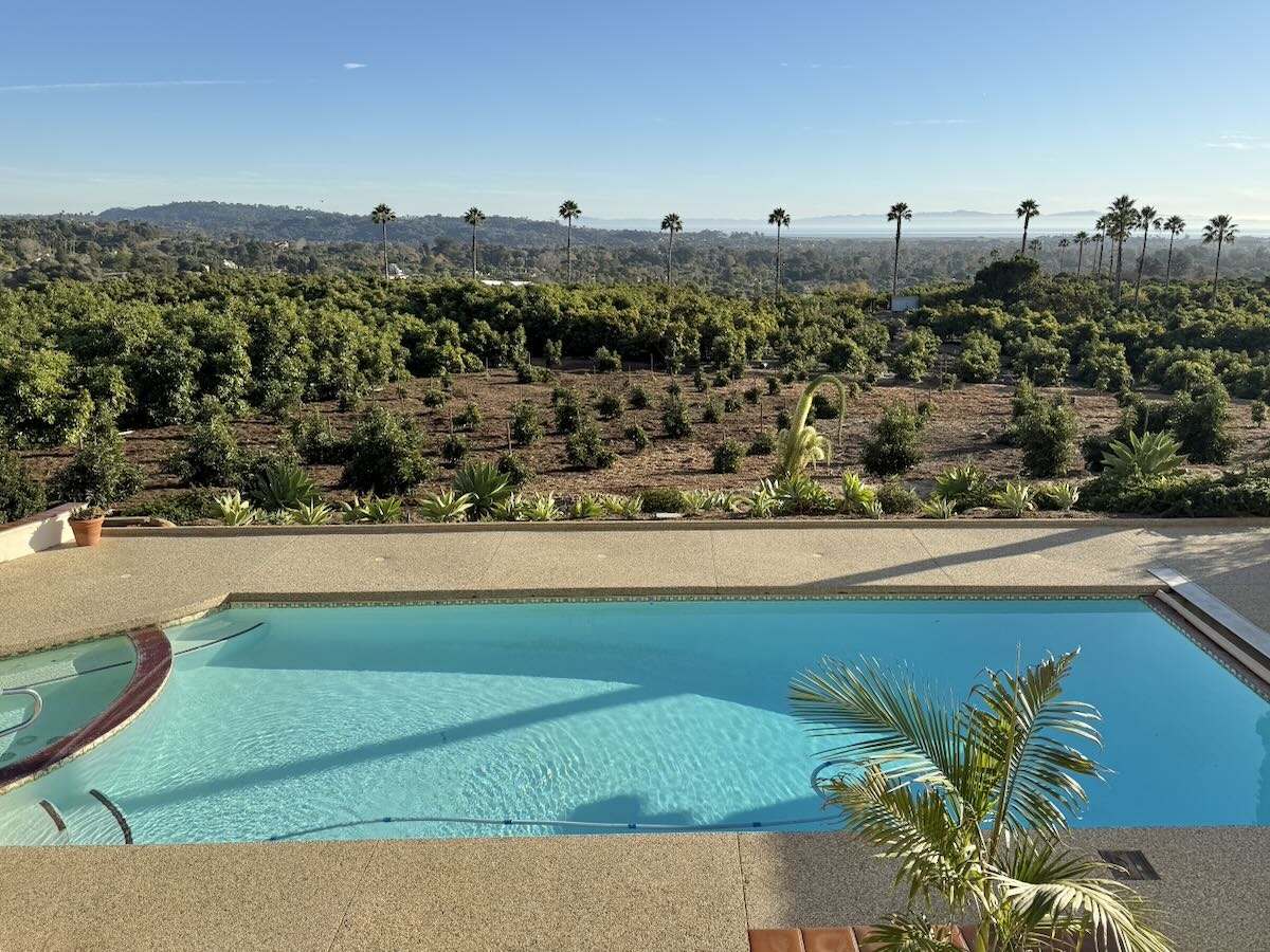 39.44 acres west of N. San Marcos Road with income-producing avocado and citrus trees and a 1980 Spanish-style house with downstairs party room and lipstick-red bathtub.