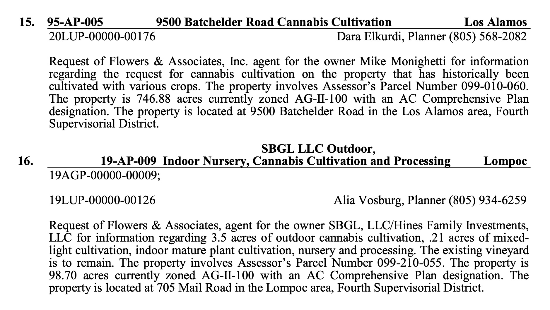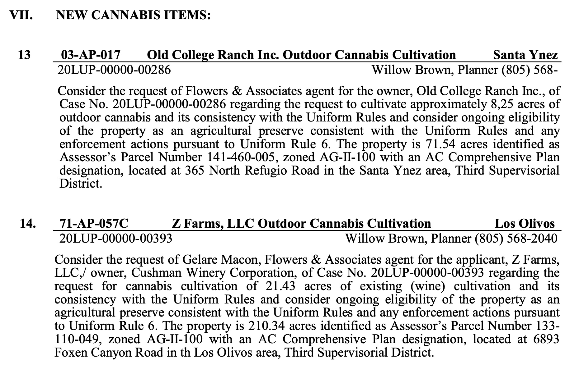 ••• The January 8 agenda of the county’s Architectural Preserve Advisory Committee includes 780 acres of cannabis cultivation in the Santa Ynez Valley.
