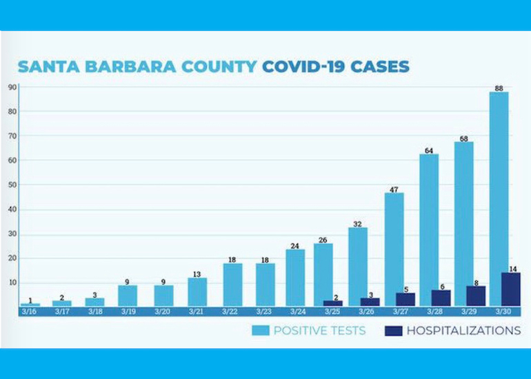 ••• “There are now 88 confirmed cases of Covid-19 in Santa Barbara County. 49 of the confirmed cases are recovering at home, 14 people are hospitalized, and 10 of those are in the ICU. 19 of those who have tested positive are considered to be fully recovered.” —KEYT (graph courtesy Santa Barbara County Public Health)
