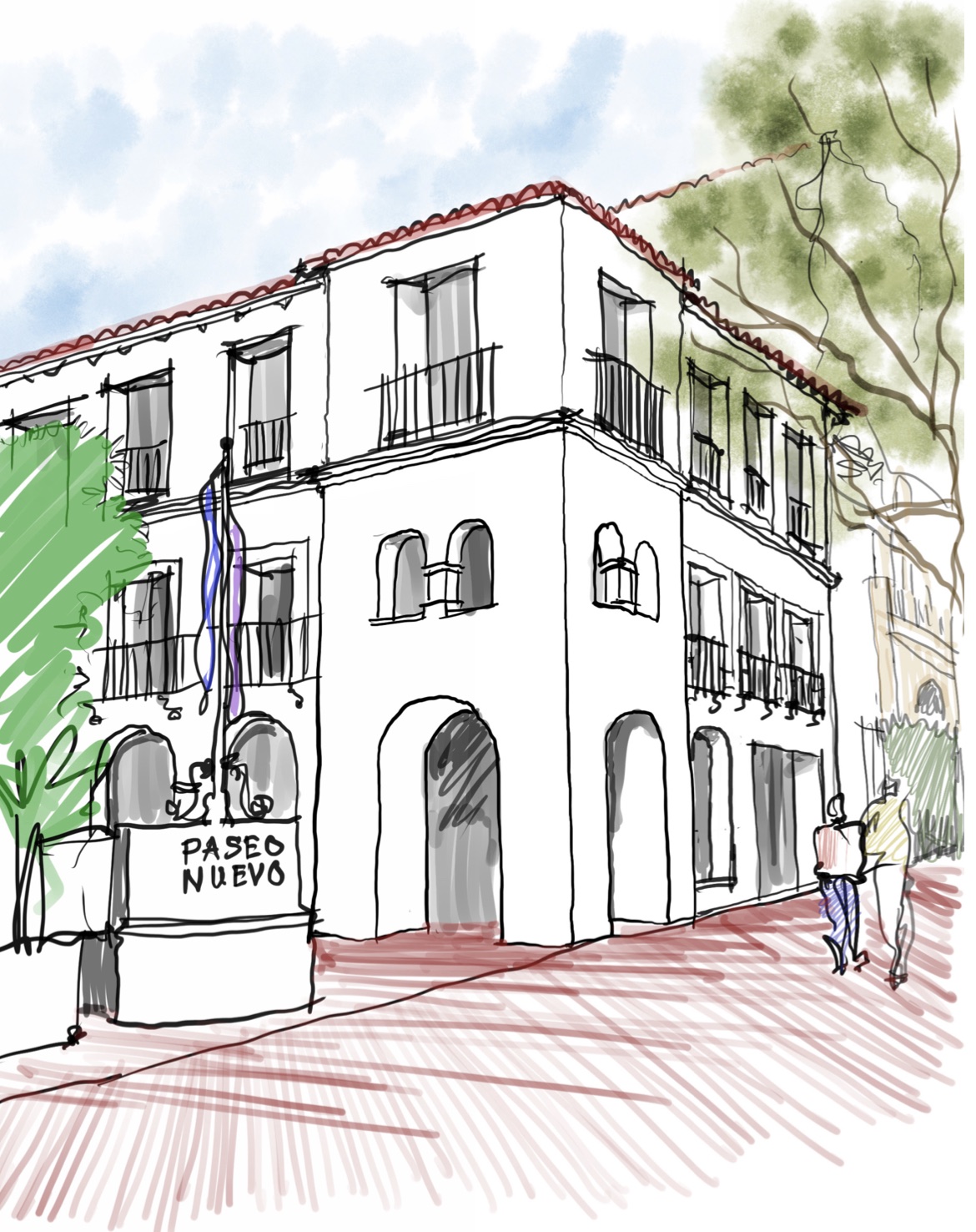 The Las Tiendas Building, constructed in 1925 in the Spanish Colonial Revival style, by A. C. Sanders, is a designated Structure of Merit. Proposal to renovate the existing 7,110 square foot two-story commercial building to a new 14-room hotel with food and beverage service. The project includes a 2,732-square-foot (net) third-story addition with a roof deck and elevator shaft, and an expansion of the existing basement. Development Plan Approval findings are required for the construction of 2,996-square-foot (net) new commercial floor area. In-Progress Review of a trellis at the roof deck, building sections to illustrate parapet heights, and roof, door, window, plaster, and balcony details.