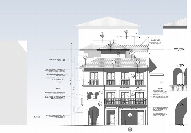 The design will include rehabilitation details including: restoring round arches at the corner of the first floor, restoring the original color of the building, removing the modern tile bulkheads on the De La Guerra street elevation, and restoring the window size and wrought-iron balconies along the State Street elevation. The carved roof rafters and stenciled eaves will be reused; if too deteriorated, these elements will be photodocumented and documented with detailed scaled drawings prior to their demolition before being recreated to match existing. As part of the design, a cornice will be added to delineate between the lower two floors and the new third floor, to match the existing column capitals on the De La Guerra Street elevation.