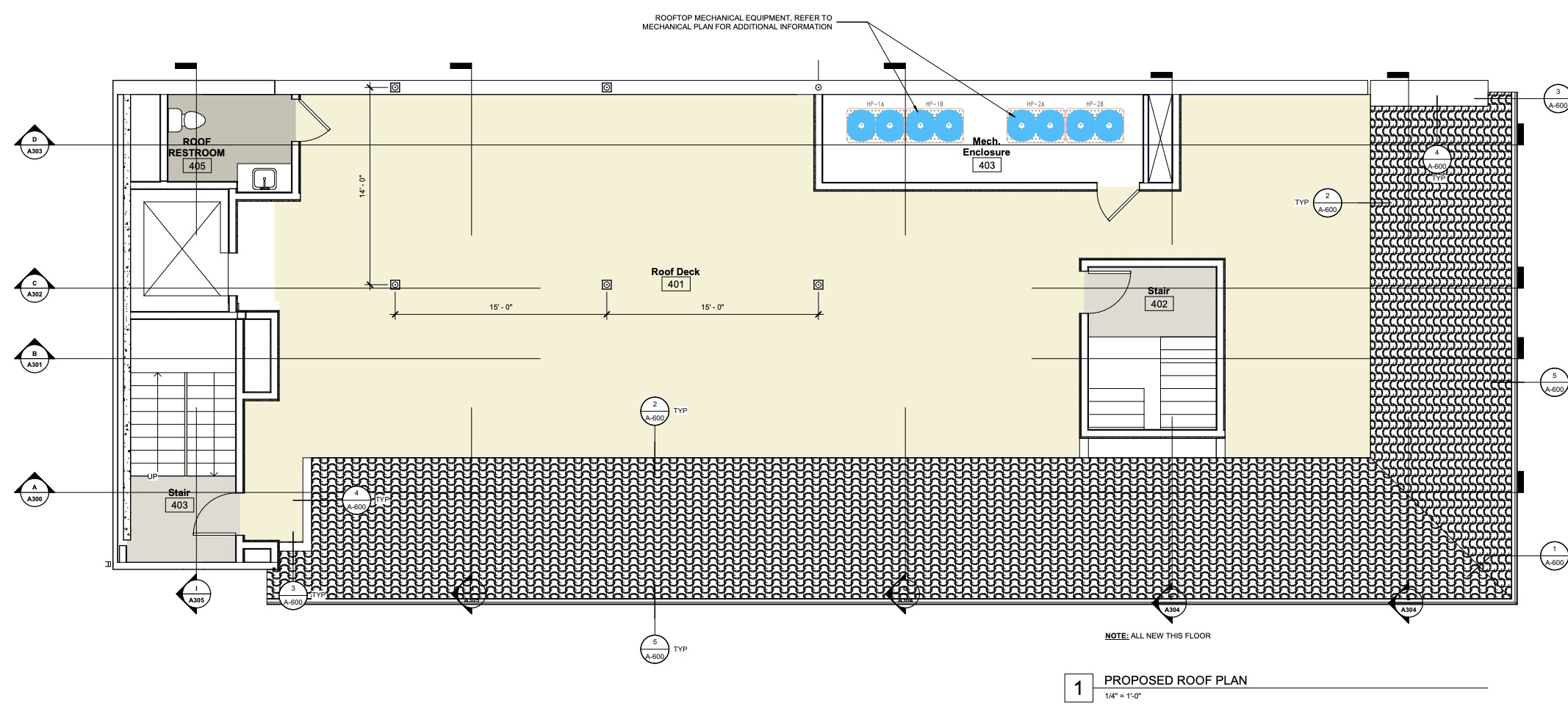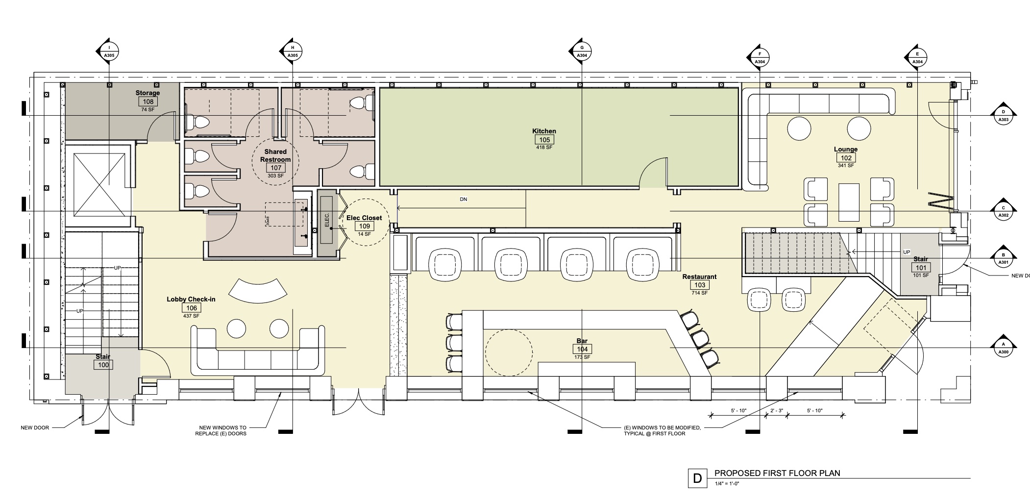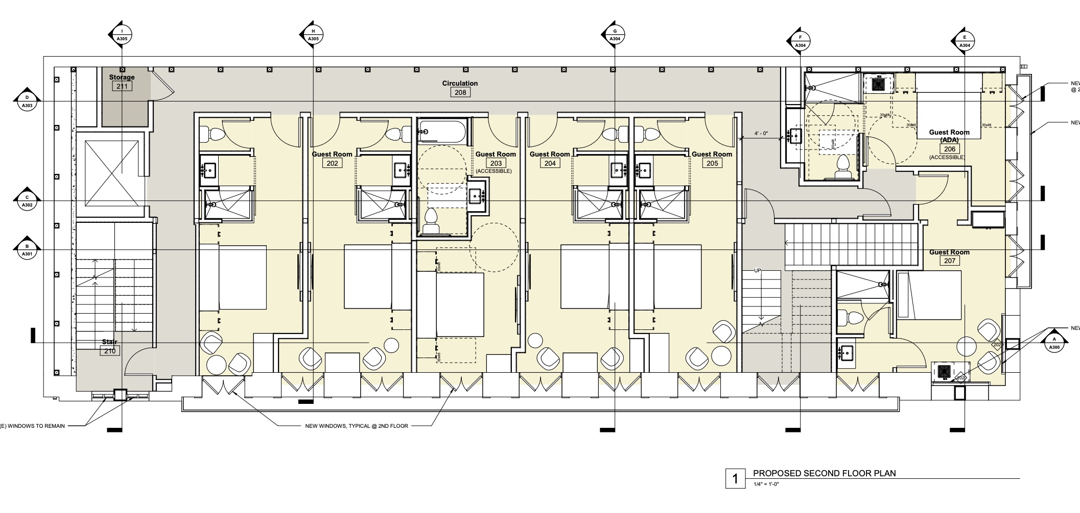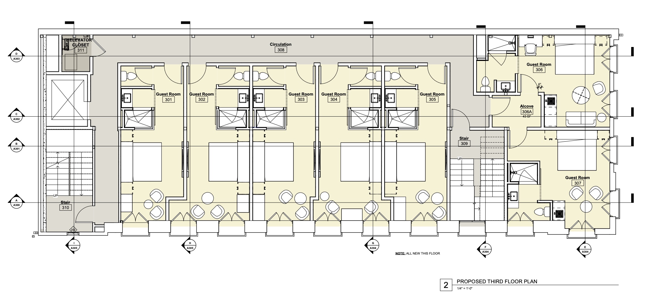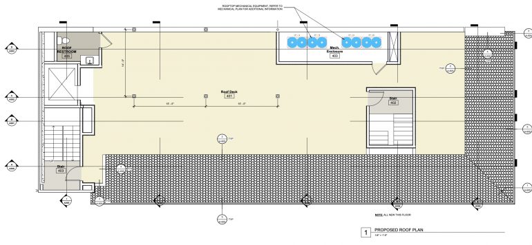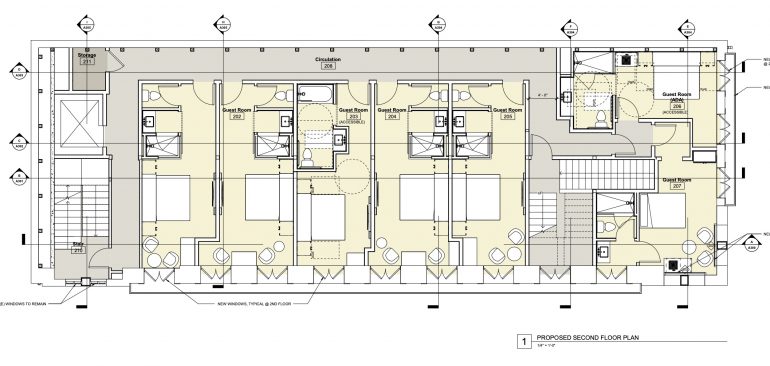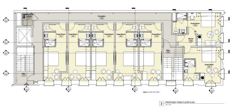 There would be seven hotel rooms on second and new third floor. Initially, I thought the property might be going for the high-end—why else bother with just 14 rooms?—but there are no suites and none of the rooms have separate tubs. We’ll have to wait to see who the operator ends up being.