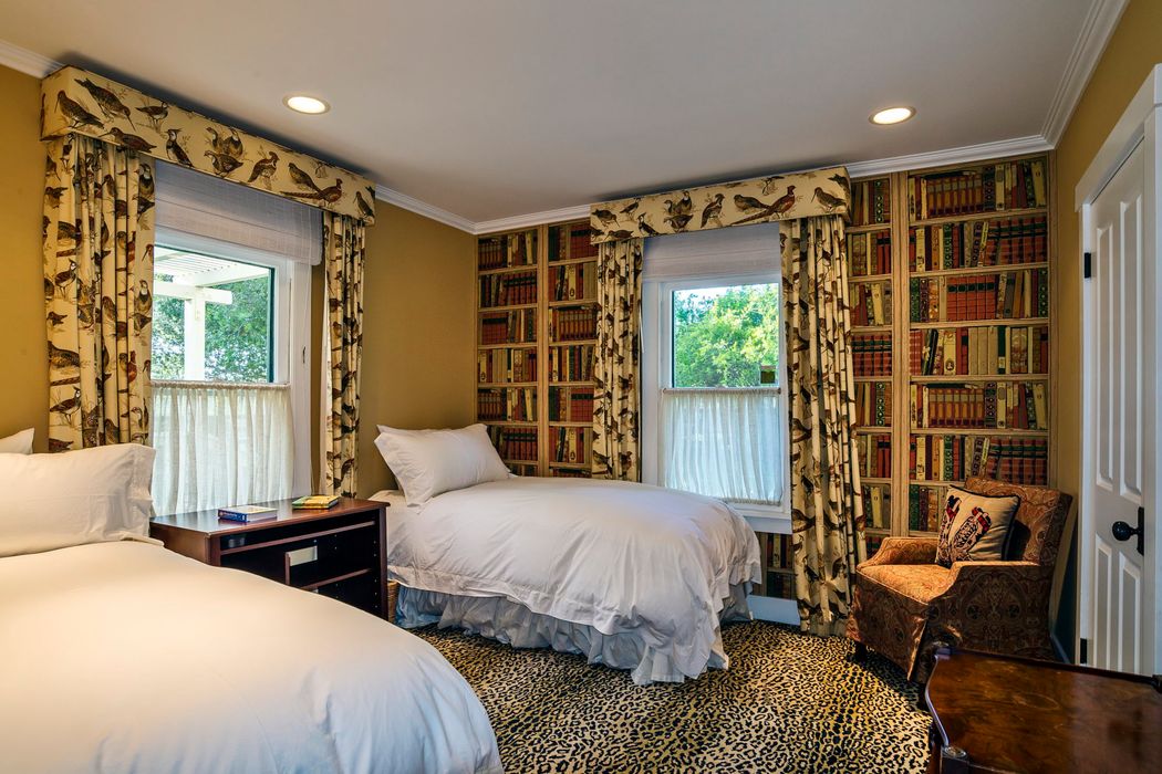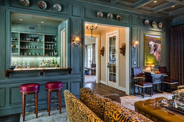 What makes the property really stand out, however, is the main house. Built in 2009, the 8,200-square-foot residence has been decorated with gusto. Note the leopard-print sofa in the bar.