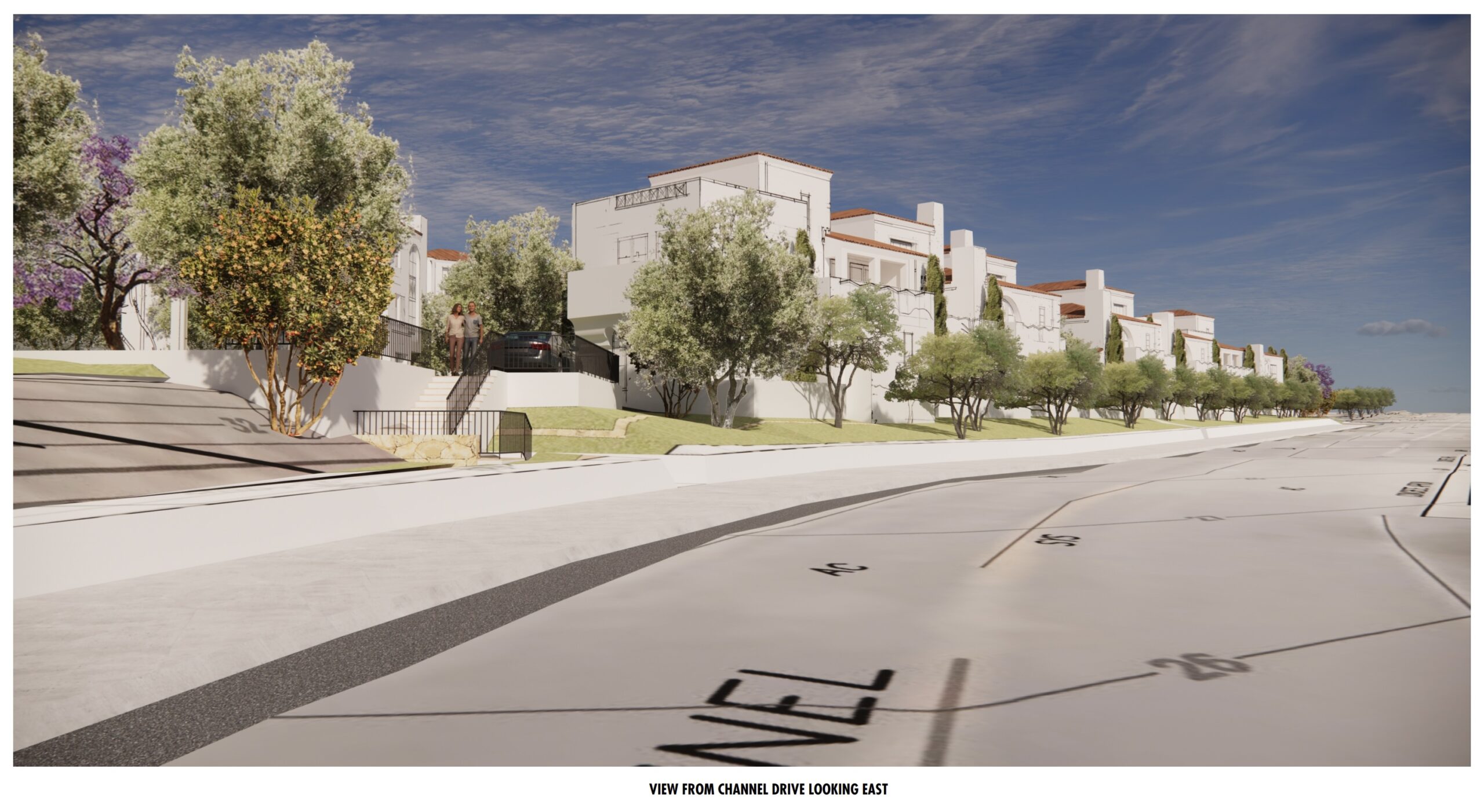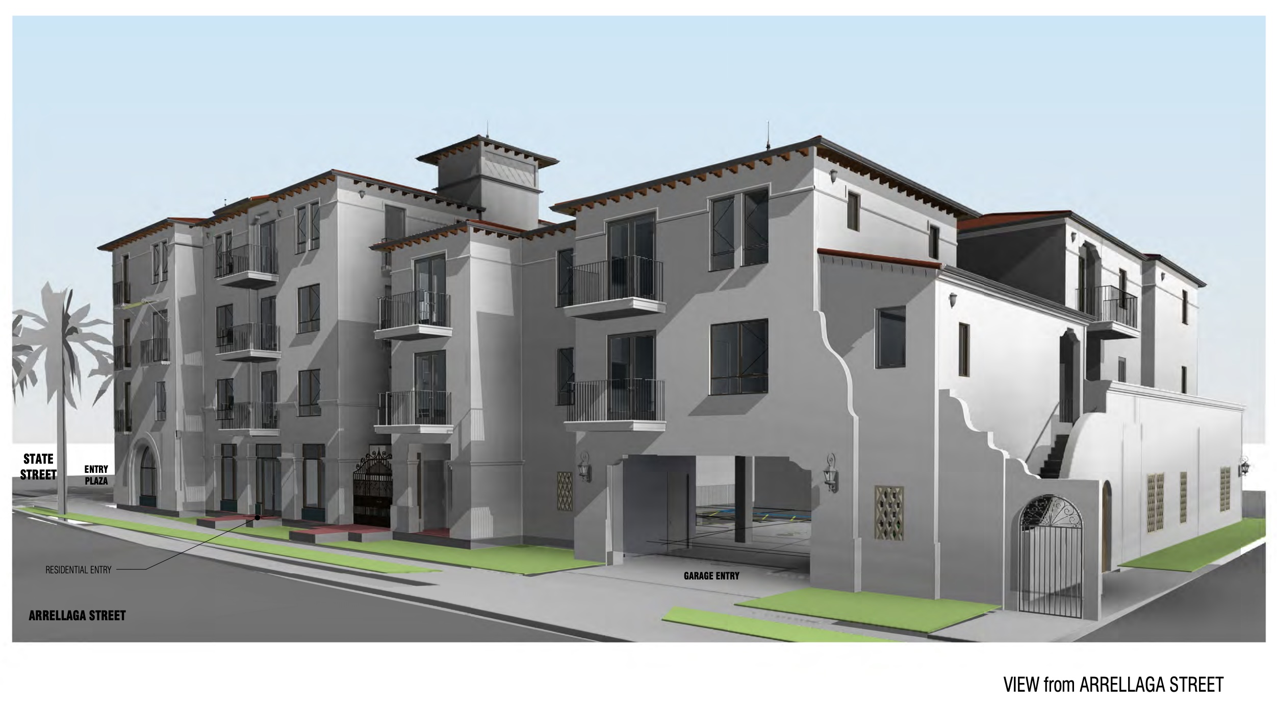 ••• The September 25 agenda of the Historic Landmarks Agenda includes the 22-unit townhouse complex proposed for 1 Hot Springs, the triangular lot between the freeway/train tracks and the Santa Barbara Cemetery. As you can see from the new rendering above, it will be quite visible from the roundabout currently under construction at Los Patos Way, Channel Drive, and Cabrillo Boulevard.