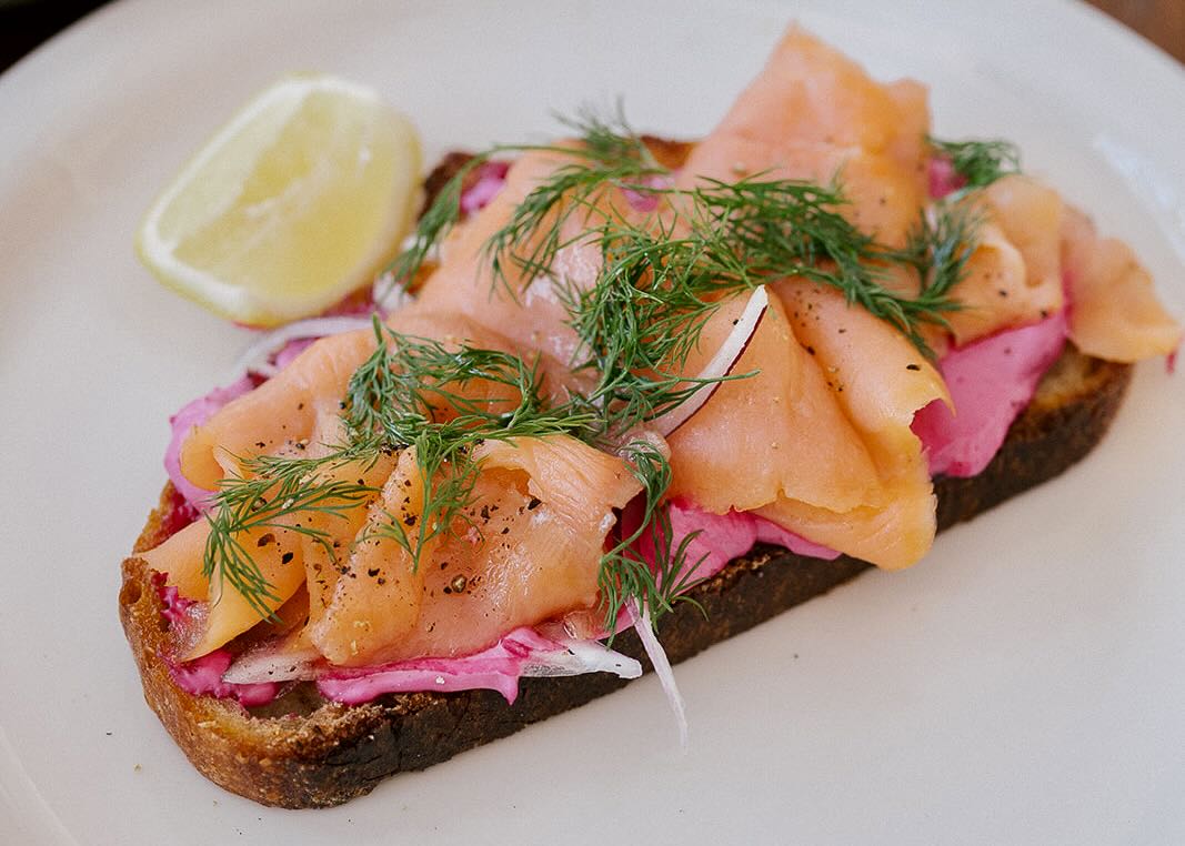 ••• According to Noozhawk‘s profile of new La Paloma Cafe chef John Parker, “the menu is in transition […], moving away from the ‘Ranchero’ concept” and toward “California coastal seasonal” cuisine. Above is a dish from the brunch menu: smoked salmon toast with beet horseradish cream cheese, capers, dill, and lemon. (Photo by Haley Garces.)