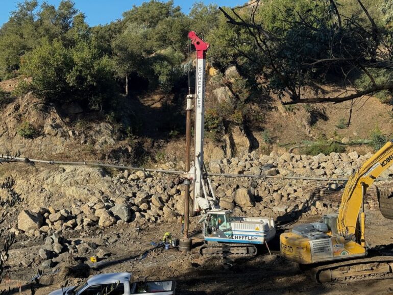 ••• “Why does the San Ysidro Debris Basin project involve drilling in the creek bed?” asked J. The response from the county’s Public Works department: “The drilling is for the piles (columns driven into the ground to support the structure) for the debris racks that will be installed as part of the project. There is a pipe in the background of the photo. This pipe diverts the water from one side of the project to the other.”