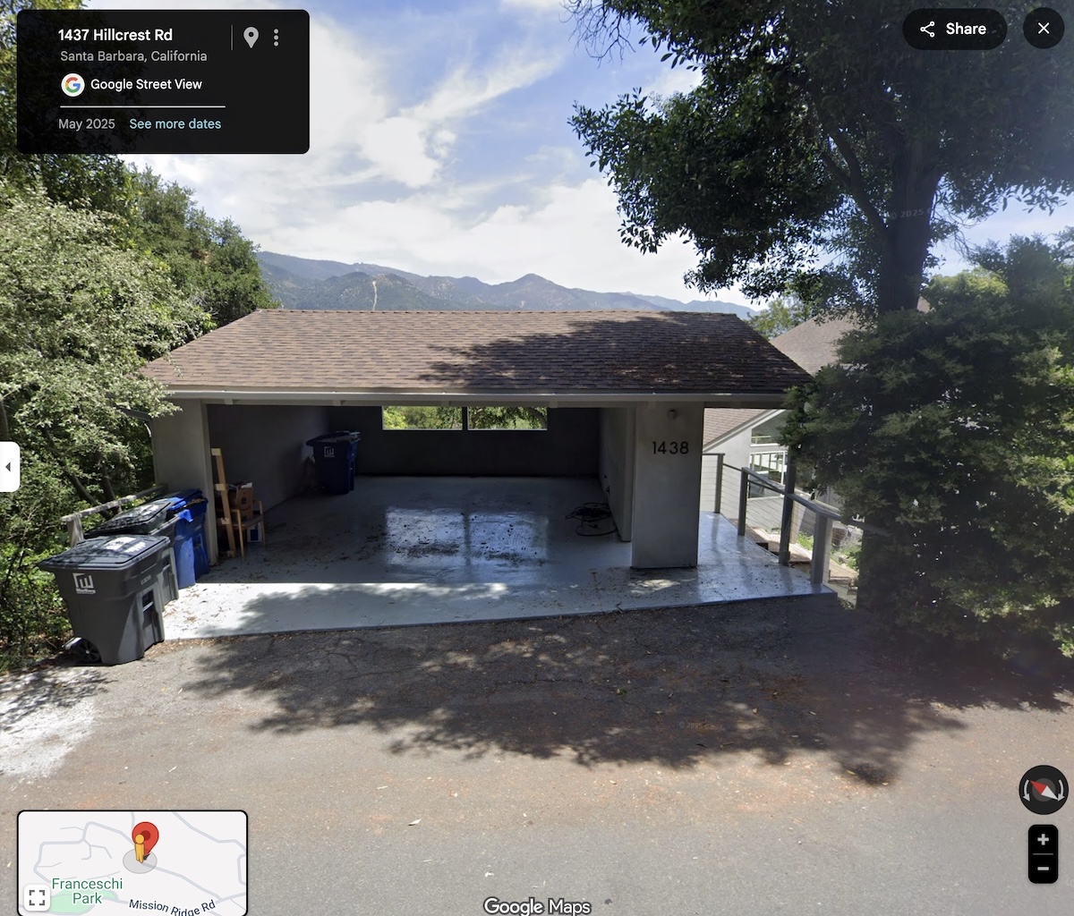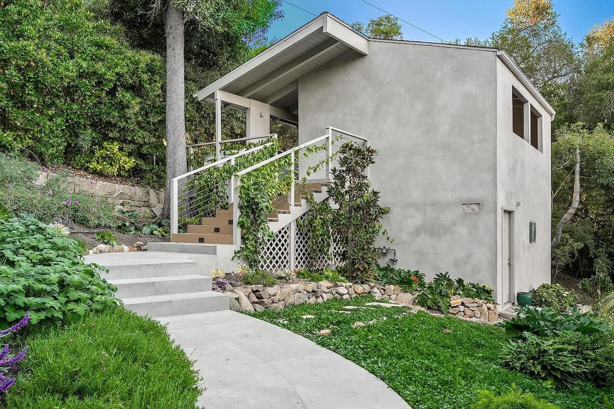 There’s more 1970s architecture at 1438 Hillcrest Road ($5.9 million), which could pass for the cross-section of a house. The gray facade and pedestrian roof do it no favors, but inside is another story, with voluminous rooms, big back-of-the-Riviera mountain views, contemporary finishes (like the concave kitchen cabinets), and bathrooms that look especially sharp with no toiletries on display. The primary bath really goes the extra mile—check out the atrium with bathtub. N.B. The matching outbuilding is the garage; you access the house via a path alongside it.
