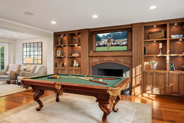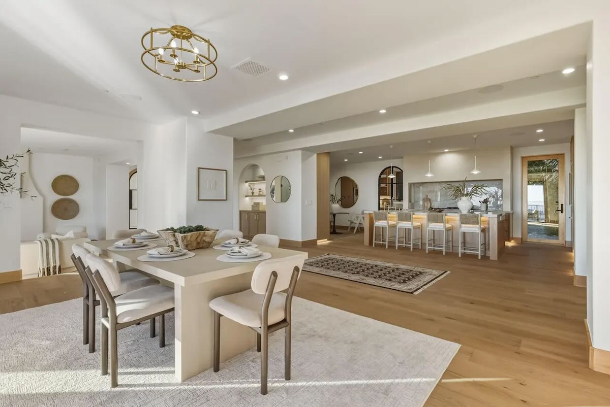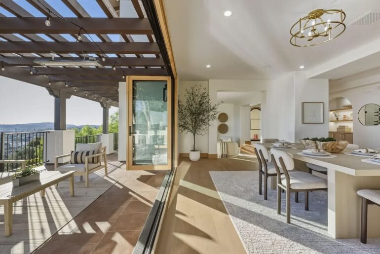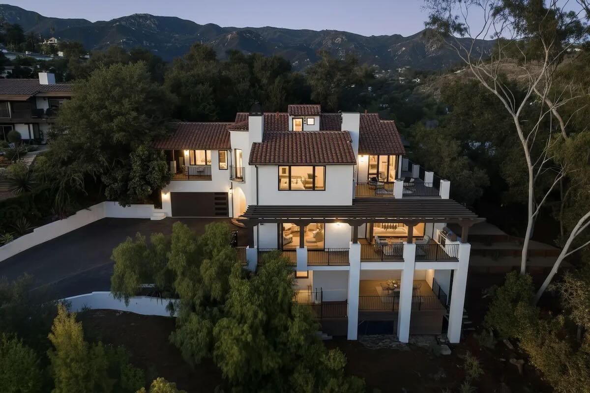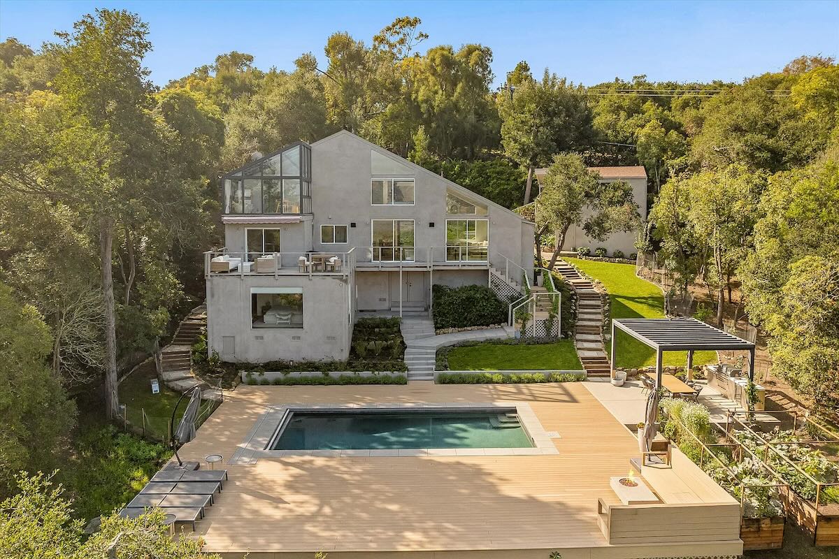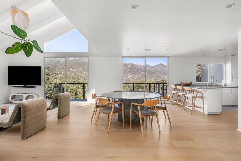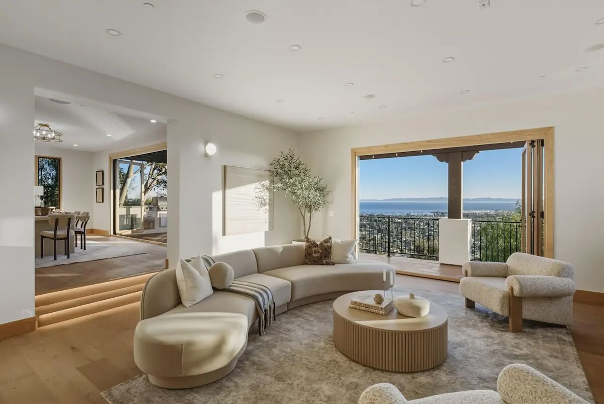The seller of 210 Las Alturas Road ($6.389 million), at the street’s lower end, paid $3.132 million in September 2023 and gave the 1987 house a clean, of-the-moment renovation. (A before photo of the exterior is here.) The open-plan living room, dining room, and kitchen on the main floor are appealing, bolstered by bifold doors. The six bedrooms include a windowless one next to the garage and two on the lower level that share a small hallway bath.