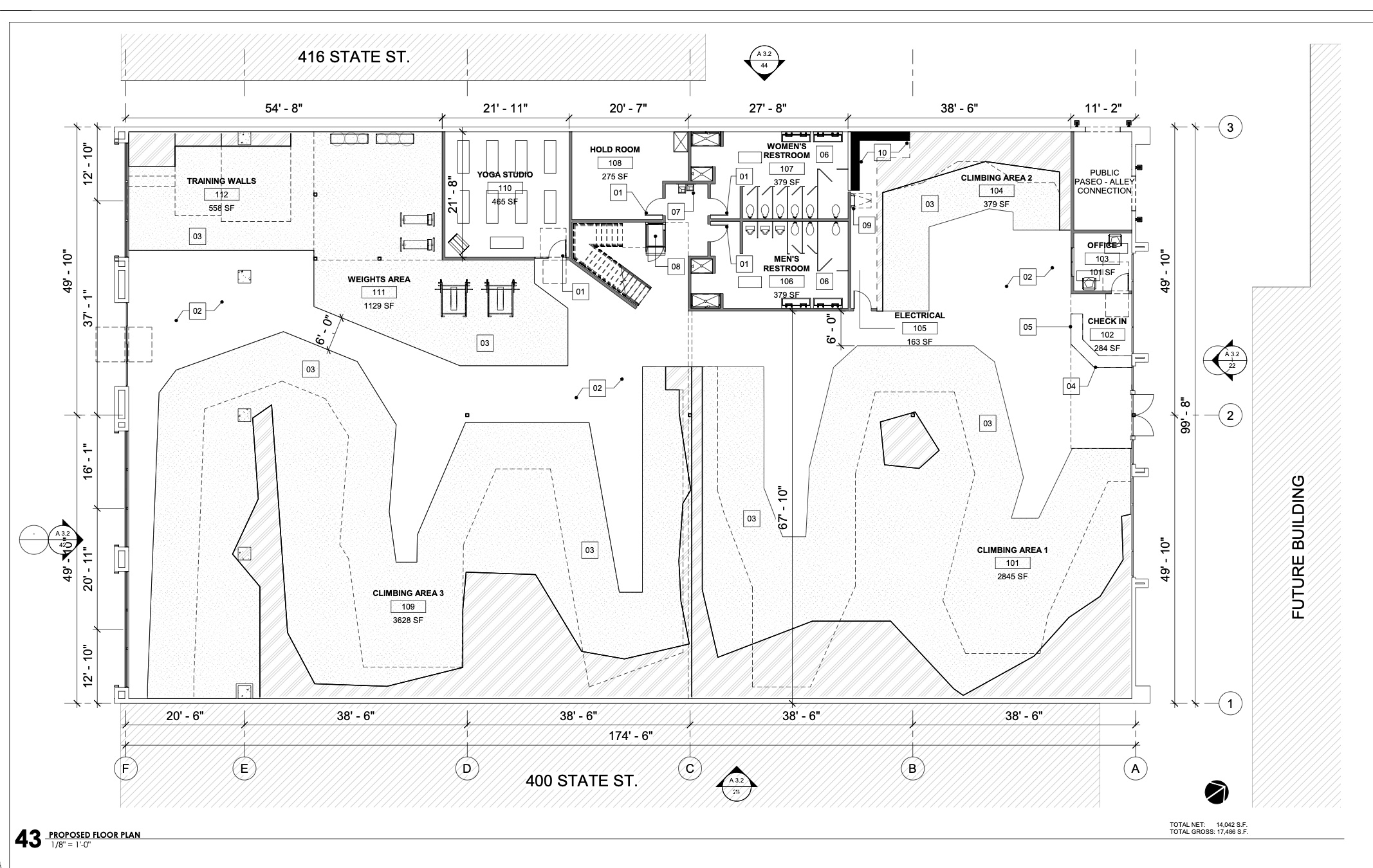 Last August, the News-Press described the plans for the complex: “This new development involves retaining and modifying the approximately 17,150 square-foot building at 410 State St. and retaining the approximately 6,800 square-foot building at 409 Anacapa St., a voluntary lot merger to combine the three parcels, and construction of a new 84-unit, four-story Priority Housing project over the east parking lot.” The climbing gym will be in the building where the Staples store used to be (and Reality Church has a one-year lease). It certainly makes for interesting floor plans.