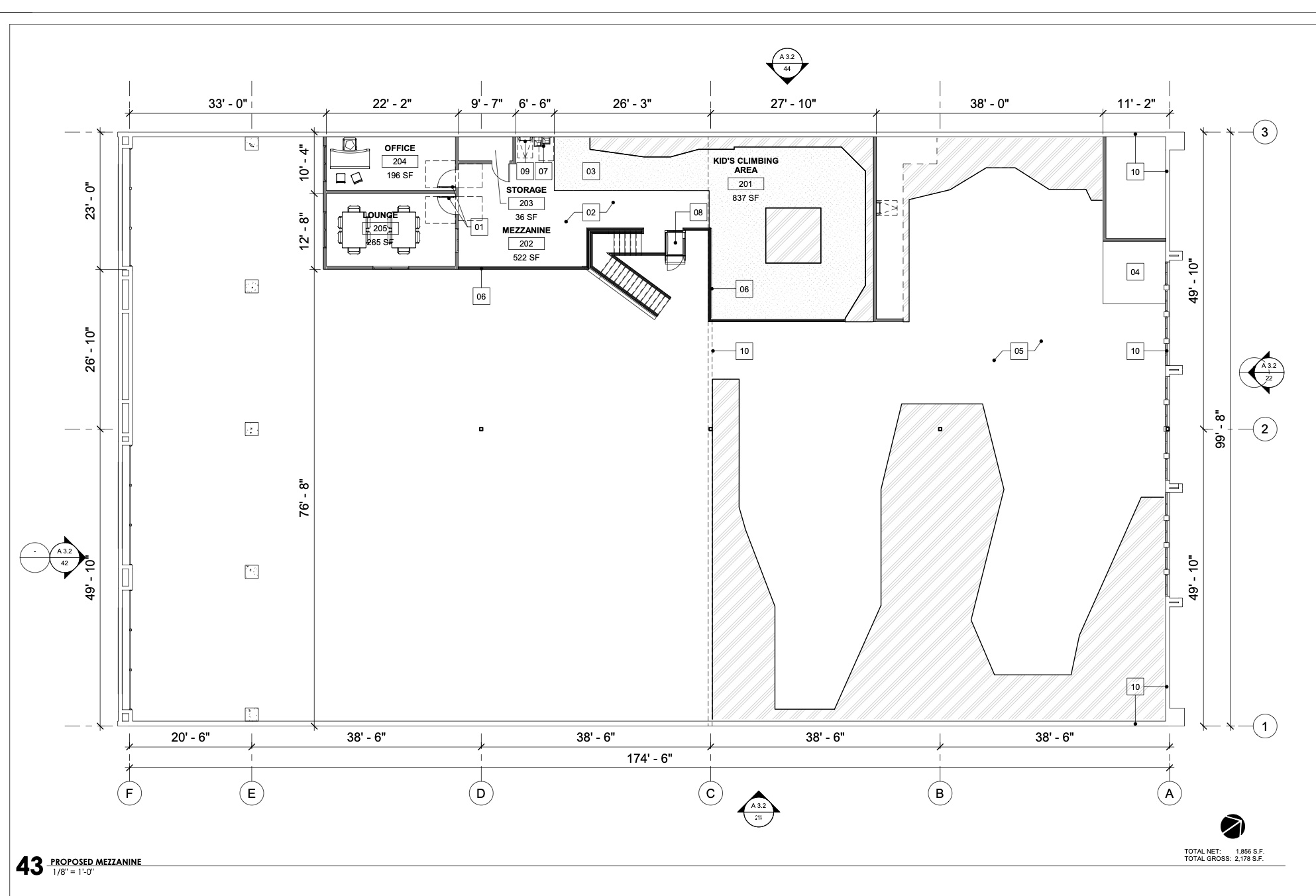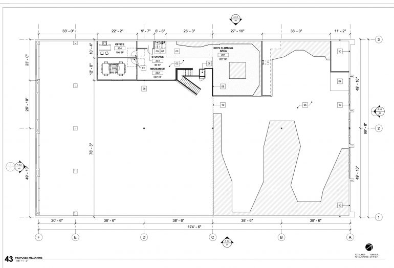 Proposal for an upper story addition at a non-historic structure in El Pueblo Viejo Landmark District to accommodate a new climbing gym. The project consists of the removal and lift of 7,734 square feet of the existing roof and framing structure to construct a new 1,856 square foot mezzanine.