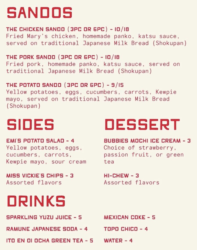 Nick has fond memories of enjoying Katsu sando during his visits to Japan, where this beloved sando is a staple. Featuring a breaded and deep-fried cutlet, often made from pork (tonkatsu) or chicken, the Katsu sando is traditionally served on Japanese Shokupan bread. It is widely available throughout Japan, from subway stations to department stores and convenience stores, as both a snack and a meal. Inspired by the great taste and amazing flavor of this sando, Nick has long envisioned introducing it to America.