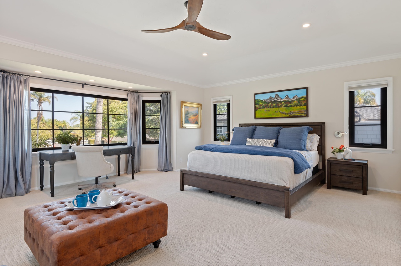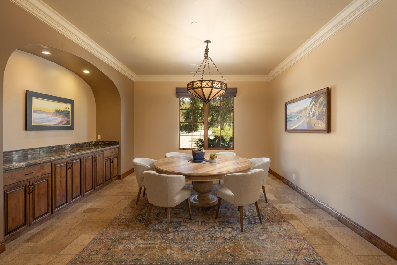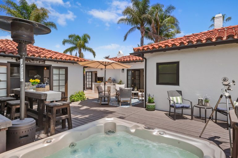 On the stub of Marina Drive that’s not in Hope Ranch, 3455 Marina Drive ($8.5 million) is a four-bedroom house that has been split into a two-bedroom main house and a two-bedroom ADU; recombining them wouldn’t be that hard. Either way, the interiors are ready for a refresh. (Imagine the walls in a creamy white.) The ocean views are fantastic, and the round stone building holds a “party loo” half bath. (The phrase is in quotation marks but it’s all mine.)