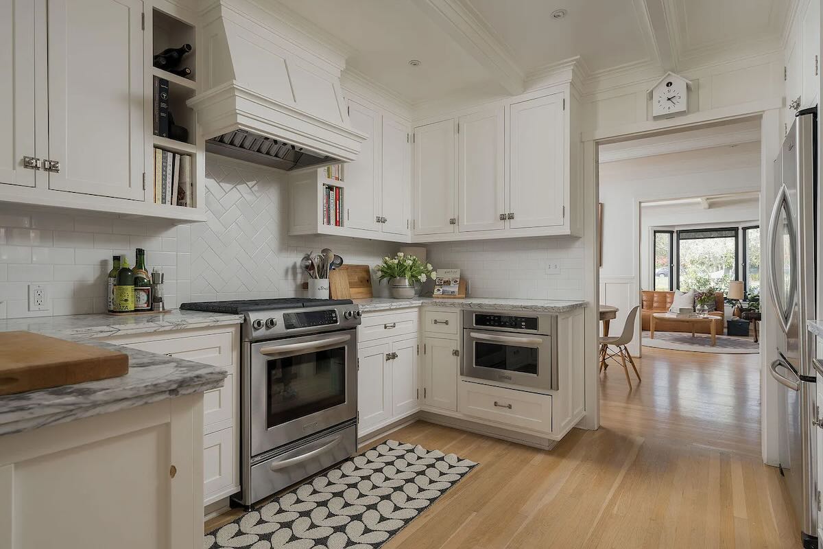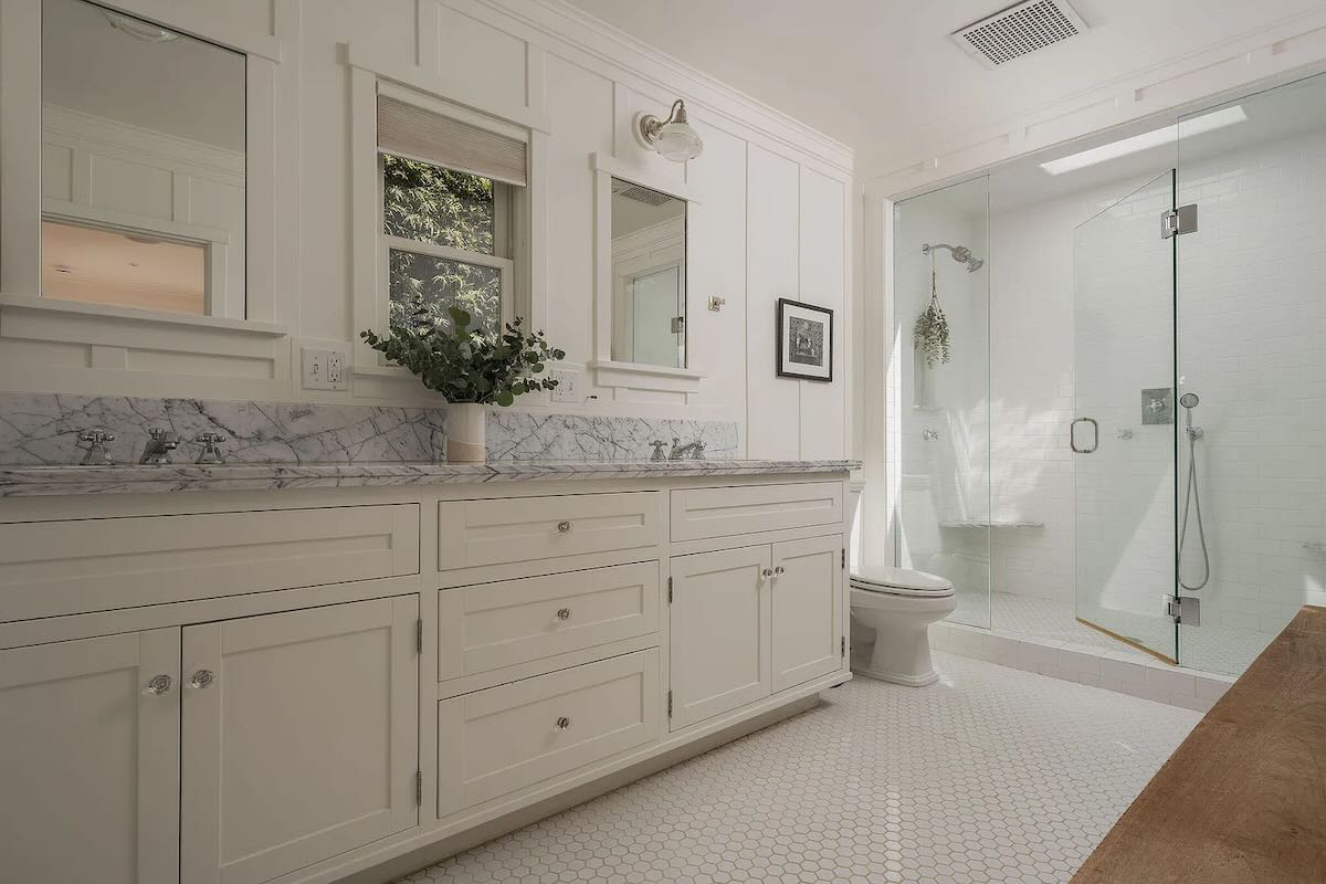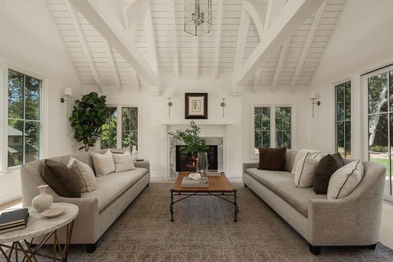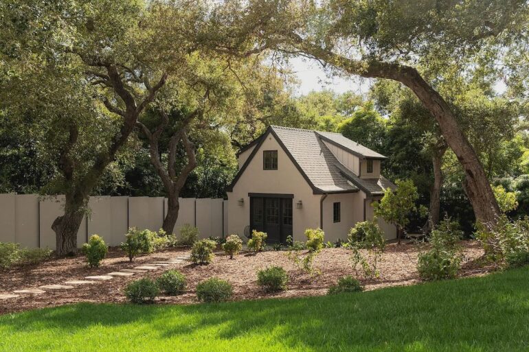 The seller of 850 Rockbridge Road ($9.75 million), who paid $3.2 million in the spring of 2021, did something similar to the 1987 Tudor in Riven Rock (before photos are here), making it appear like a contemporary take on traditional. While heavy on white, it has good energy. I suspect it will be appealling to families, because the two guest rooms and their hallway bath are next to the upstairs primary, the third-floor room is ideal for playtime, and there’s a big lawn out back. The cute cottage on the far side of the front yard would benefit from combining the two stories into a single lofty space.
