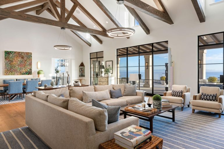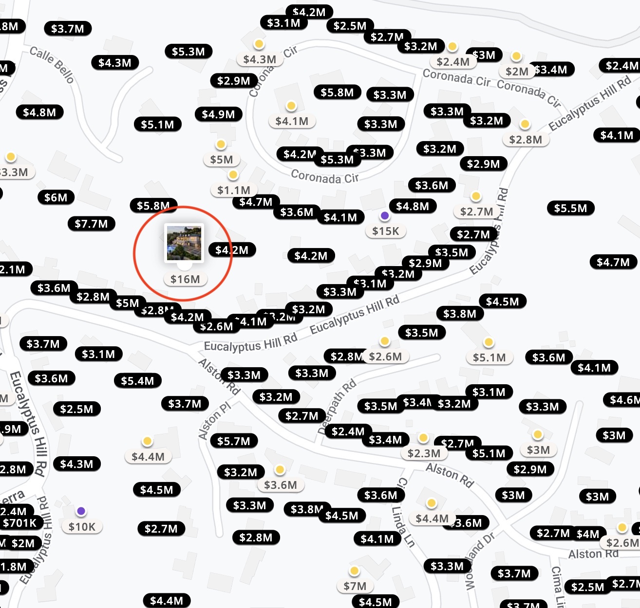 1893 Eucalyptus Hill Road ($16.5 million) is big (6,314 square feet) and relatively new (2020), with crazy views and an interesting architectural style—a hybrid of old Europe and contemporary America, punctuated with occasional pops of bold interior design (e.g., the Op Art elevator). The location near downtown Santa Barbara trades convenience for prestige; just outside the Montecito border, the property is not in one of the fancier parts of Eucalyptus Hill. There are worse things than living in a far more fabulous house than your neighbors….