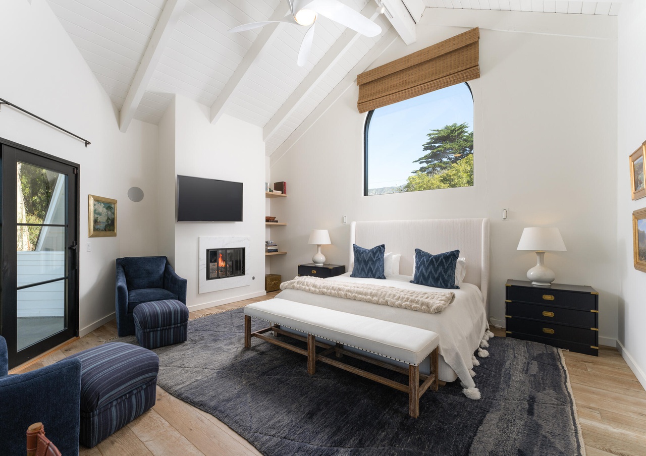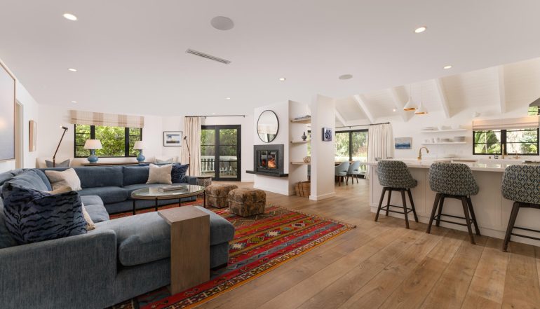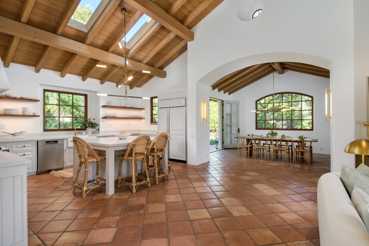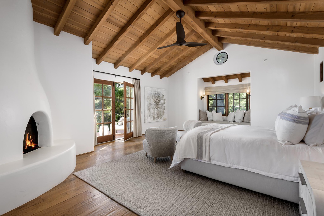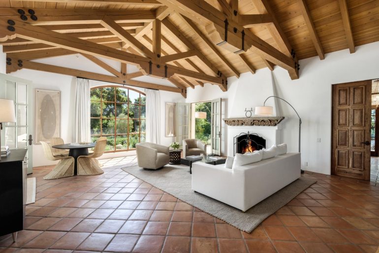 The 1999 Spanish Colonial at 849 Ashley Road ($13.4 million) in Montecito has an appealing sprawl in the four-bedroom main house, and there’s a guest house on the far side of the pool. The listing says the property was “reimagined,” but I would wager that didn’t include the floors—which look workable, and larger rugs would really help. (That said, I’d change out the floor in the primary bath, and it’s concerning that the other baths aren’t shown at all.) P.S. Bonus points for the wooden soaking tub, but a deduction for the shared driveway. P.P.S. Someone has a thing for a funky chair.