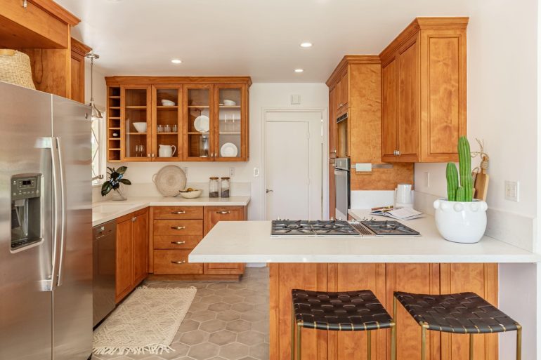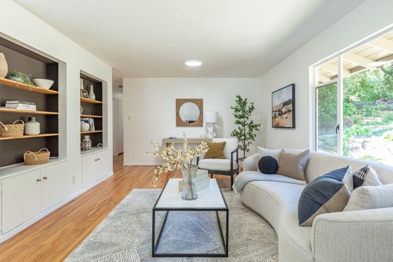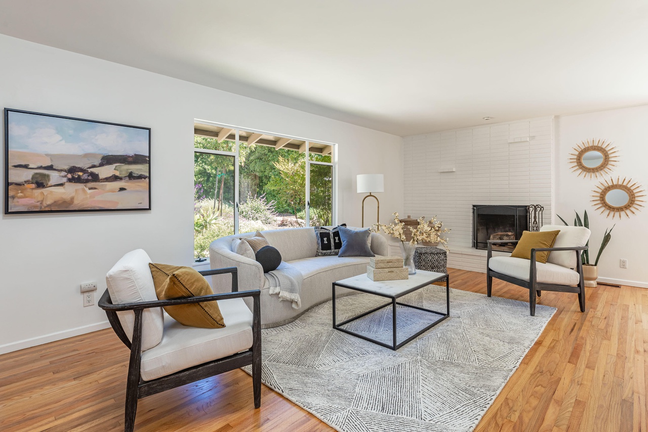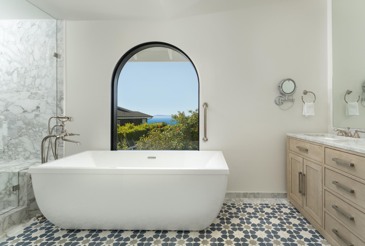 The 1999 Spanish Colonial at 849 Ashley Road ($13.4 million) in Montecito has an appealing sprawl in the four-bedroom main house, and there’s a guest house on the far side of the pool. The listing says the property was “reimagined,” but I would wager that didn’t include the floors—which look workable, and larger rugs would really help. (That said, I’d change out the floor in the primary bath, and it’s concerning that the other baths aren’t shown at all.) P.S. Bonus points for the wooden soaking tub, but a deduction for the shared driveway. P.P.S. Someone has a thing for a funky chair.