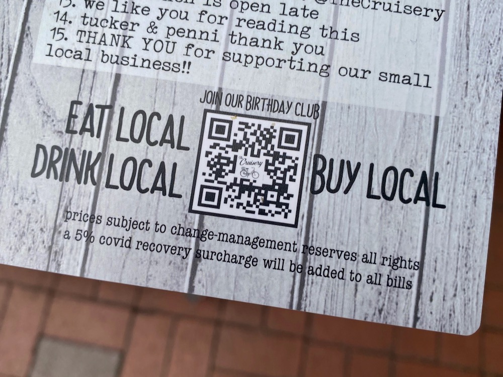 ••• L. asked me to look into the 4.7% “entertainment district fee” that showed up on her bill at the Cruisery the other night. (Someone else posted a photo on Yelp.) The restaurant didn’t respond to requests for an explanation, but the menu does mention a 5% “covid recovery surcharge,” which appears to be the fee in question. (There’s certainly no neighborhood-wide fee going on). This is just one more way a business—it happens with hotels, airfares, and much more—can charge more than the displayed price, because too many of us will balk at higher prices, even though the cost of doing business has gone up. On one hand, at least you’re warned on the menu; on the other hand, you’re unlikely to spot it before you’ve already been seated. Many restaurants often call it a service charge, but then, of course, the money has to go to the staff—presumably not the case at the Cruisery. (I might be more concerned about the management reserving the right to charge an amount different from what’s on the menu!)