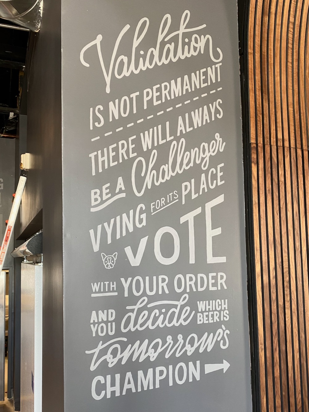 The name is also a guiding philosophy. The Deignans have backgrounds in tech, and inspired by the practice of market validation—running an idea by clients before bringing it to market—they have created two categories of beer on the menu. “The Validated ones are the most popular, and the Vying are the newcomers, which can also be from home brewers and other breweries,” explains Brian. “It forces us to brew what people buy and also to be innovative.”