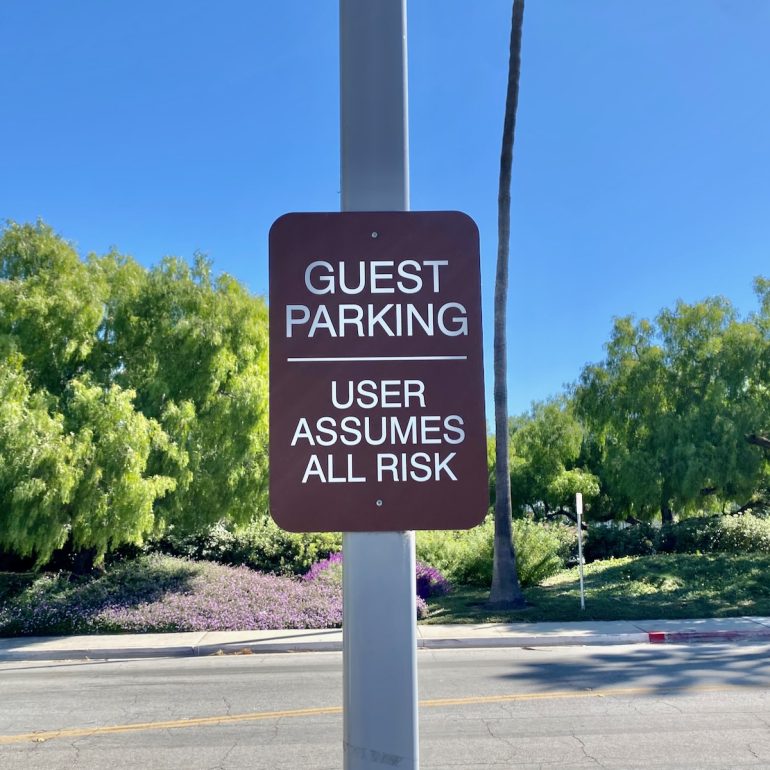 I parked at the Hilton Garden Inn, where the architect deserves kudos for getting the developer to sign off on the Art Deco roofline details. (I wouldn’t normally park in a private lot, but there were a jillion spaces and I didn’t notice a lot of street parking on my way there. I later discovered that you can park on Castilian Drive.) I assumed the signs posted at the hotel lot were the work of an overzealous lawyer…