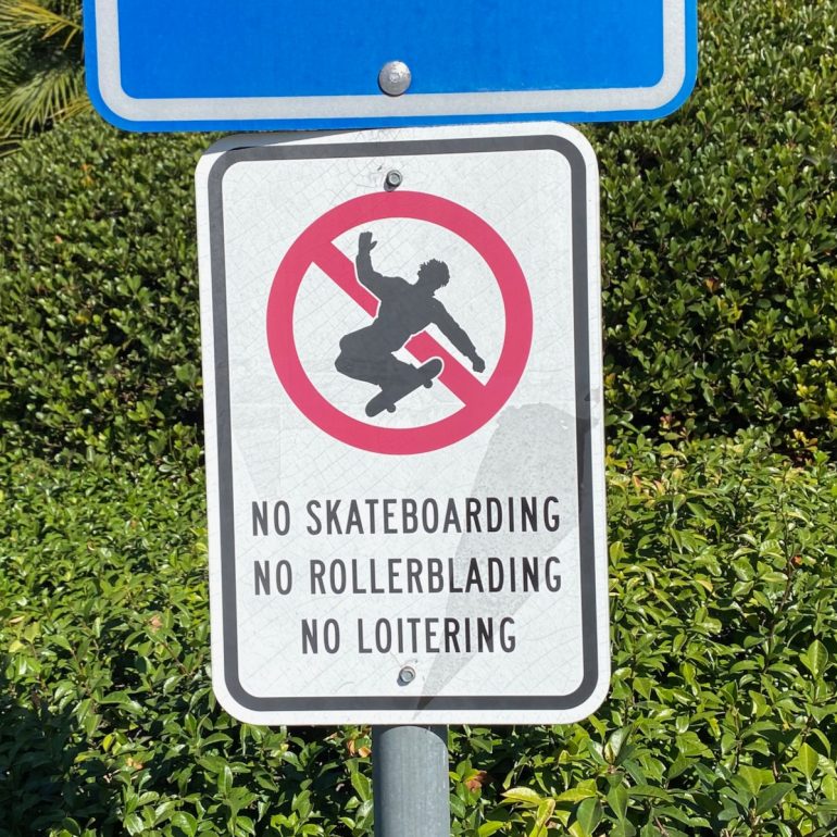 Moving on! The sign below reminded me of college, when my friend Alyce and I would Rollerblade around the office parks of Research Triangle Park in North Carolina on weekends. You get the sense that the designer has skateboarding experience.