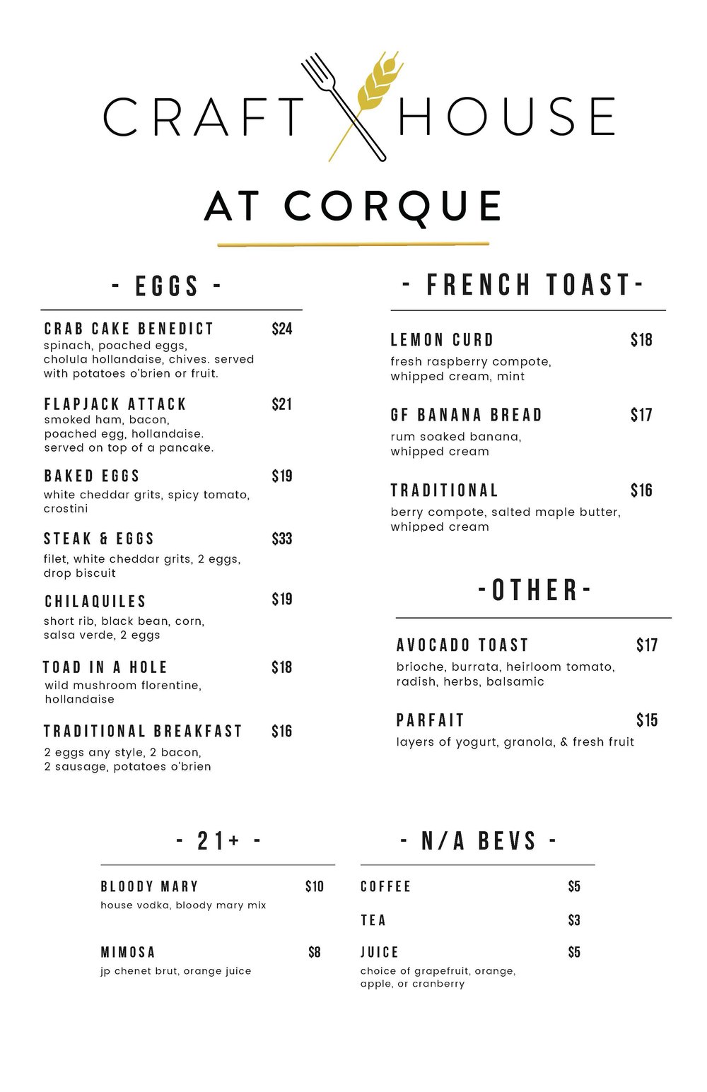 ••• Solvang’s Craft House at Corque has launched breakfast service Thursday through Monday. No word yet on when lunch and dinner will start, but the menu below is on the website.
