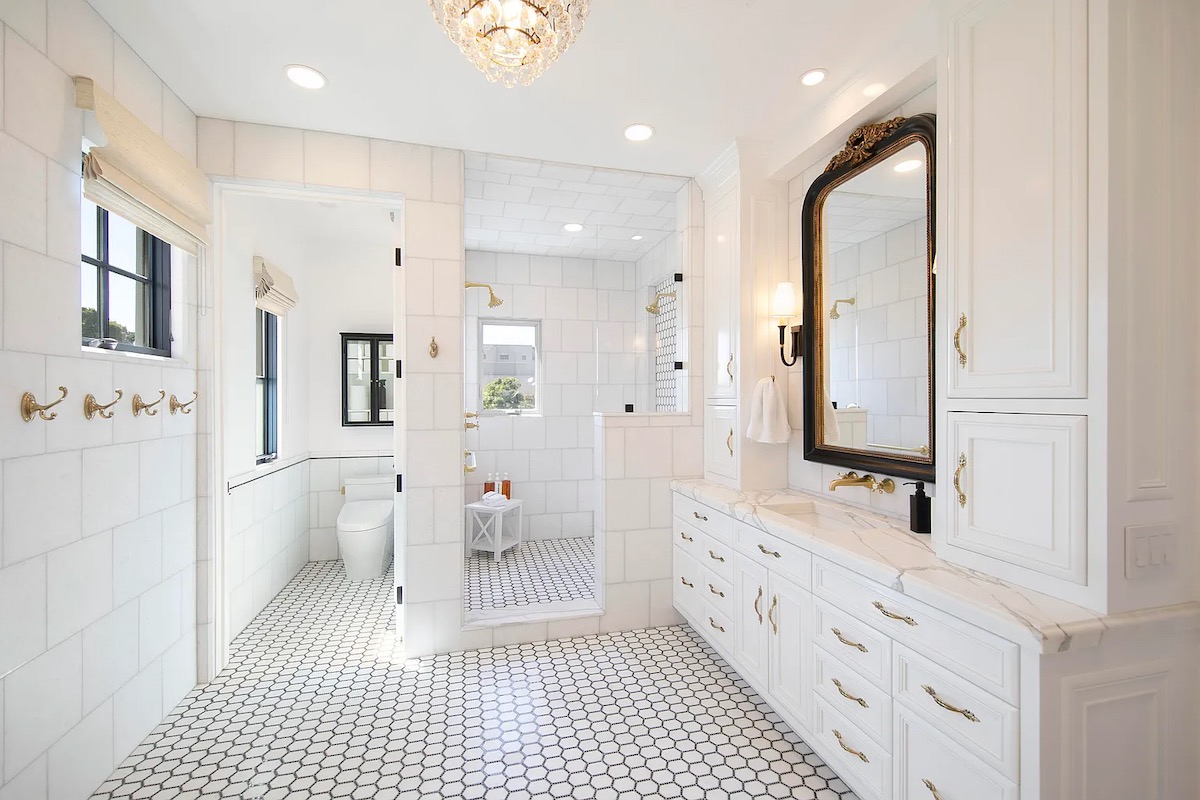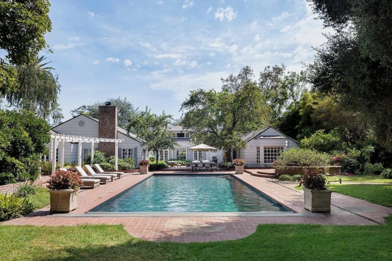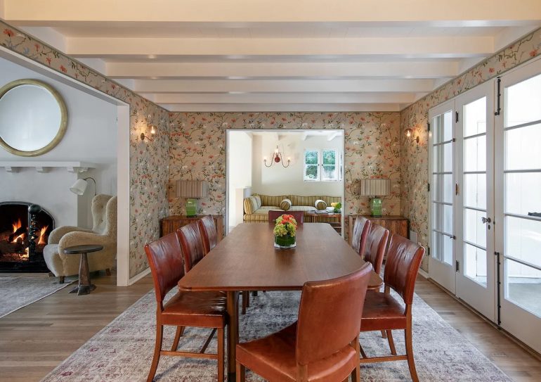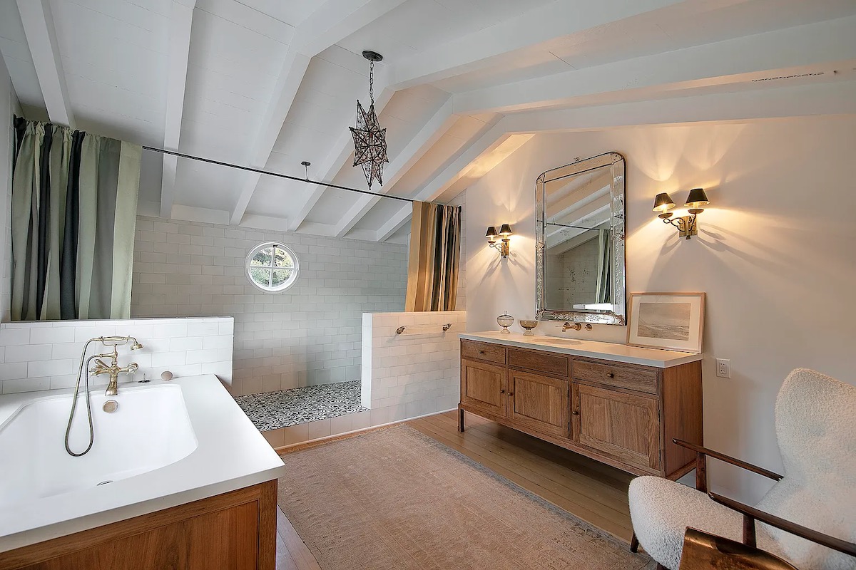 “Donald Robertson, formerly the creative director for Condé Nast and, since 2007, the creative director at Estée Lauder” (as per Dirt) bought 1586 San Leandro Lane ($8.995 million) in the Hedgerow in 2015, redid it inside and out, and put it back on the market in early 2017. The 1924 house was on and off the market for years (for as low as $4.995 million and as high as $6.599 million), and occasionally listed as a rental. It has plenty of photogenic moments—the wall of windows in the primary bedroom, the party shower in the primary bath, the courtyard pool—but the floor plan remains tricky.