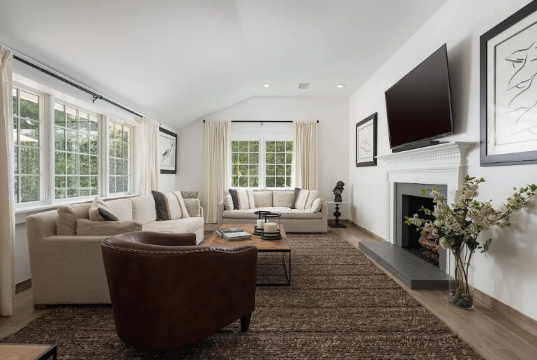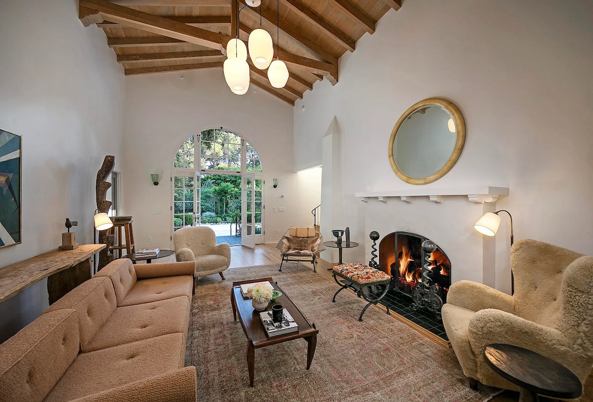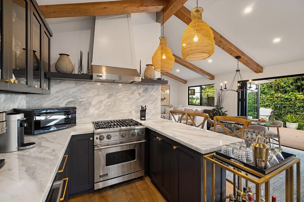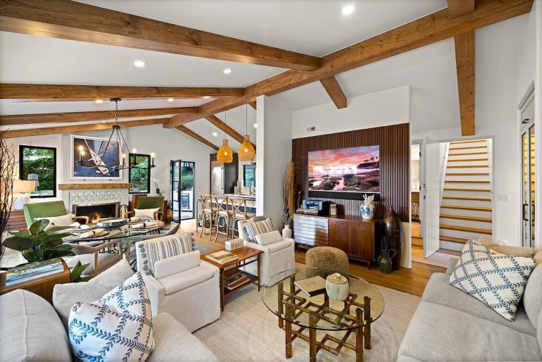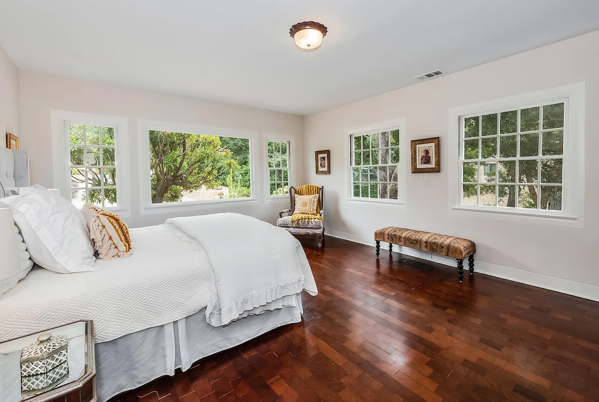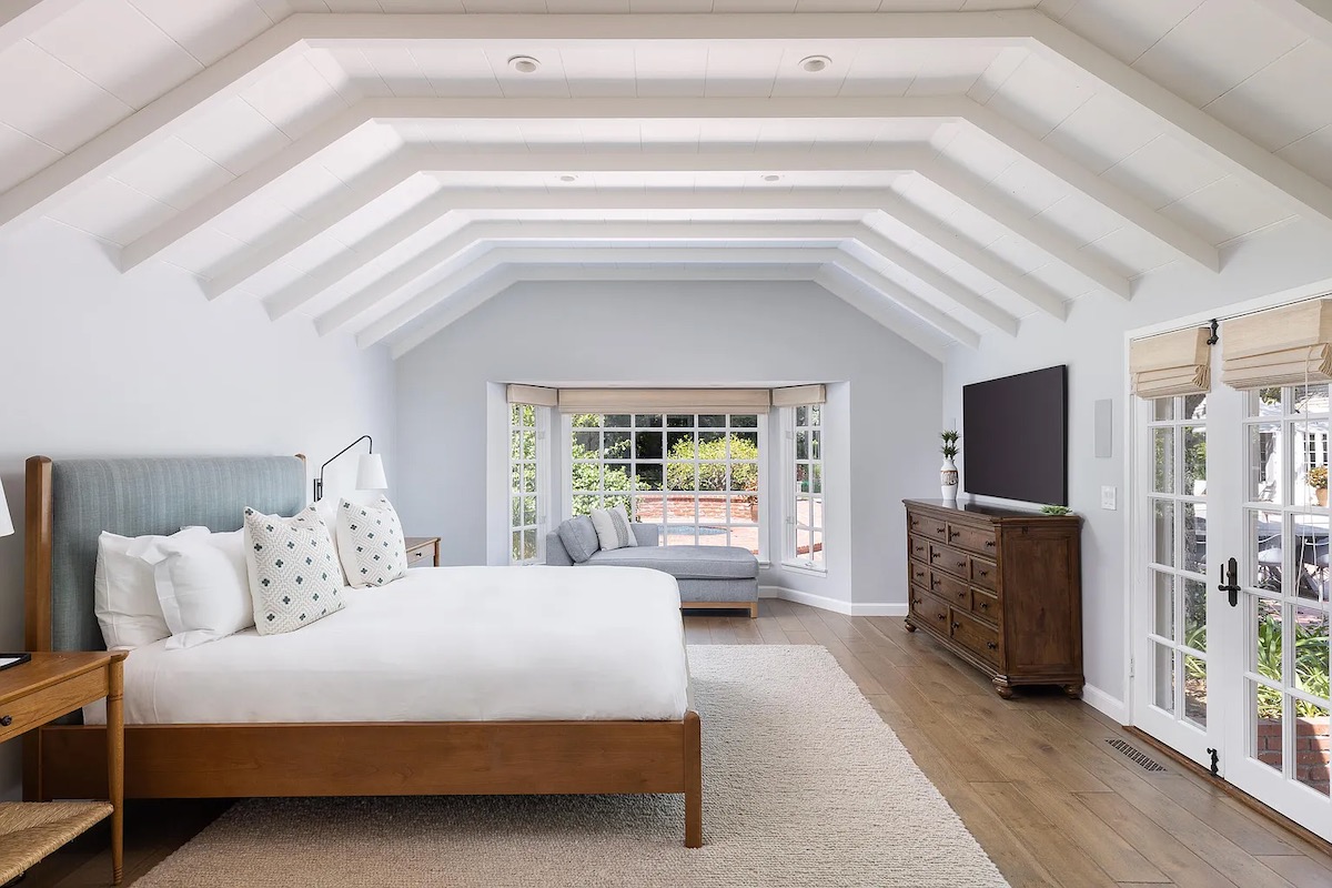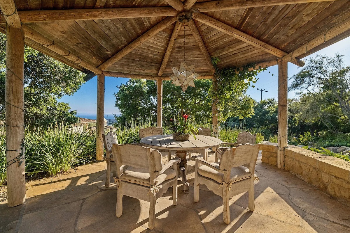 You’d think that one significant appeal of 1274 Eleven Oaks Lane ($6.7 million), directly behind Los Arroyos restaurant on Coast Village Road, would be the proximity to the many dining options a short walk away. And yet someone thought the house needed four kitchens—one on each level inside, and two outside. The interiors have panache, although I’m curious about how the cabinets above the primary bed work and why you’d want to block the lone window in that guest room. Up the hill behind the house is a cool deck.