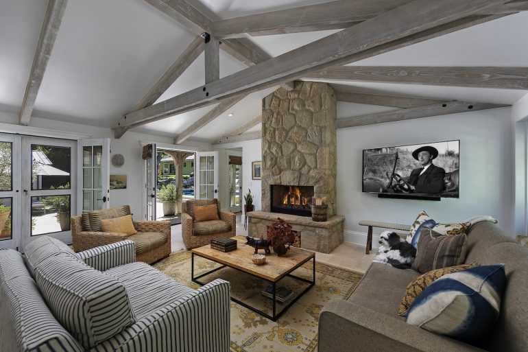 A fireplace of Santa Barbara sandstone welcomes you to the family room, reminiscent of a cottage at the famed San Ysidro Ranch.
