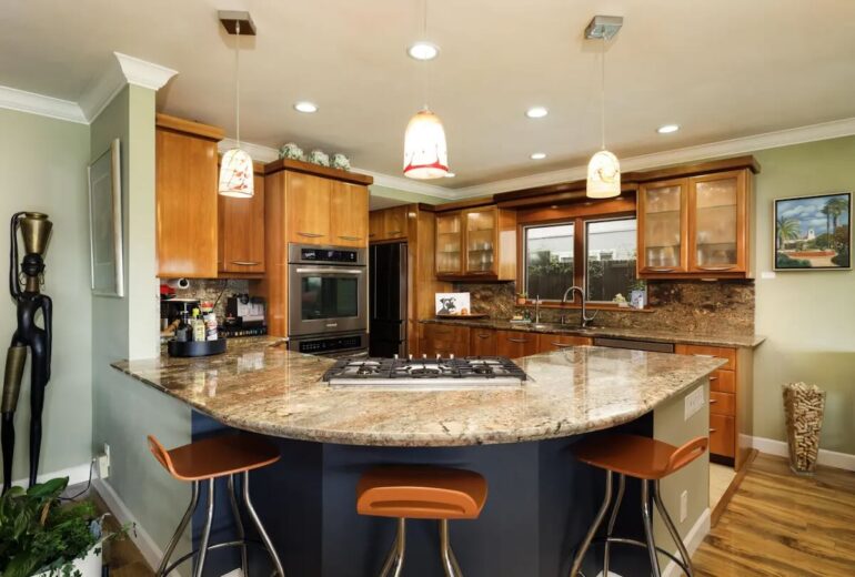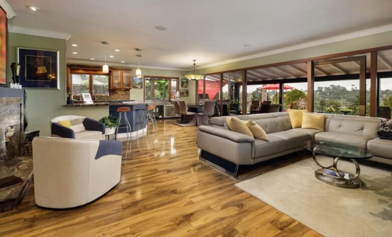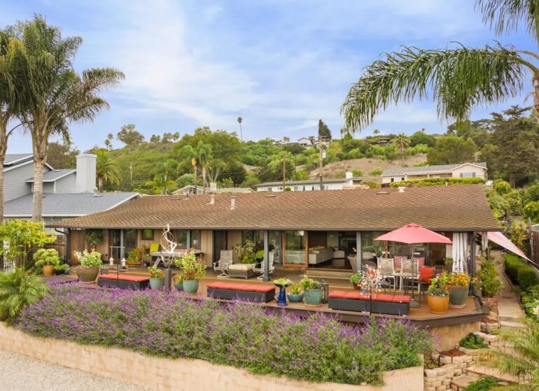 The primary bathroom at 1192 Edward Place ($2.495 million), on a cul-de-sac in Goleta, feels all wrong for the 1961 three-bedroom, which otherwise looks pretty solid. I’m not sure I’d agree that it’s “surrounded by orchards,” but the area around N. Fairview Avenue is definitely semi-rural.