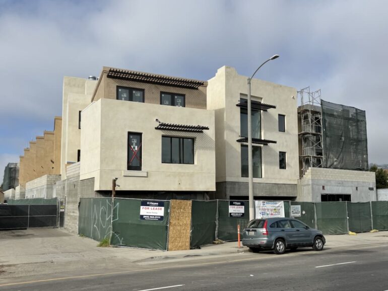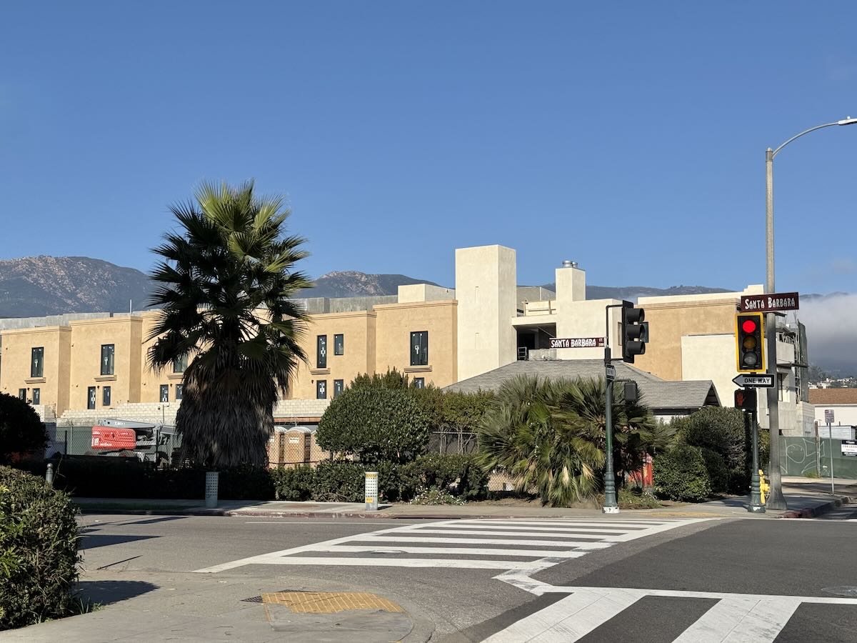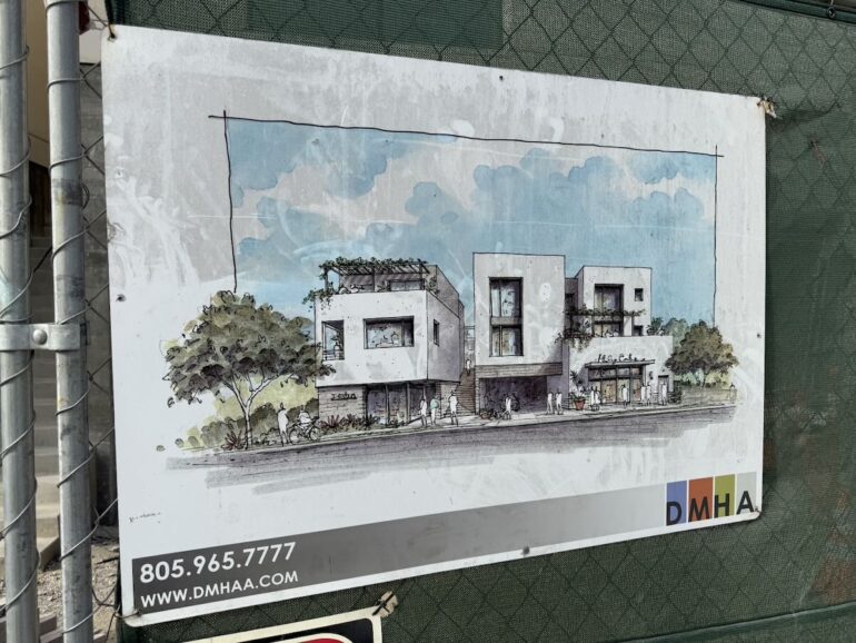 ••• The 34-unit apartment building (with a commercial storefront) at 219 E. Haley Street, just east of Santa Barbara Street, is making progress. I was alarmed when I saw the west elevation, because it’s not the complex’s best side, but then remembered that the 48-unit 201 E. Haley next door will block views of it. The rendering for 219 E. Haley shows a white exterior, but if 201 is going to be white, perhaps the beige seen below is a better idea.
