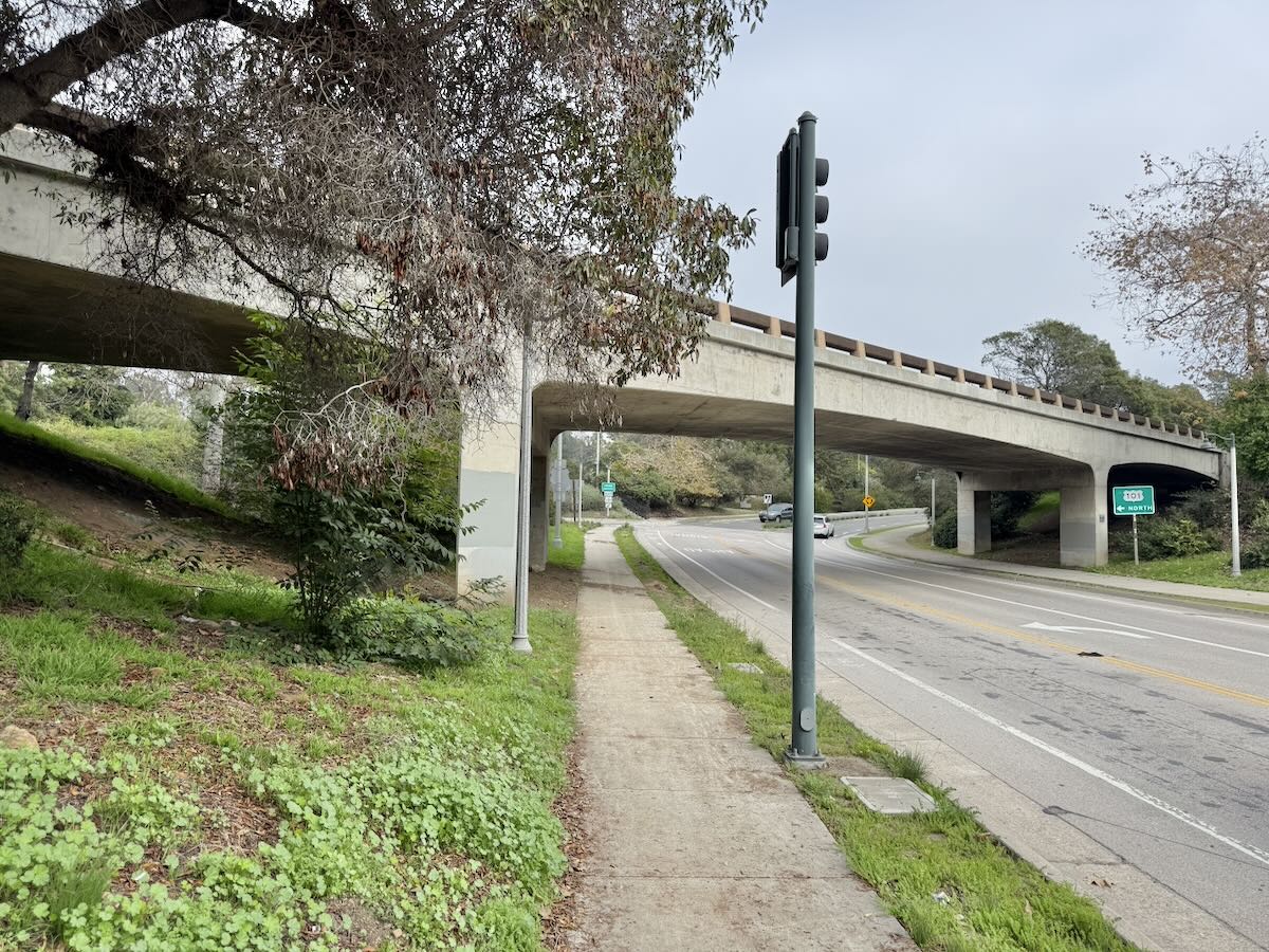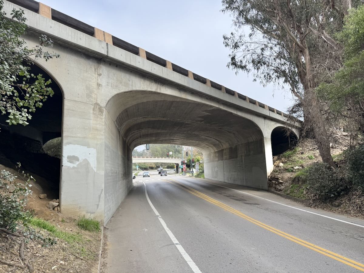 ••• In other freeway news, the start of the next phase of Highway 101 construction this spring will bring with it the end of the graceful, gorgeous southbound overpass at Hot Springs/Carrillo Boulevard. (The northbound one, in the third photo below, is less beautiful but I’ll still miss it.) I love the shape, but also the concrete, and even the patina. It has far more style than the design replacing it.