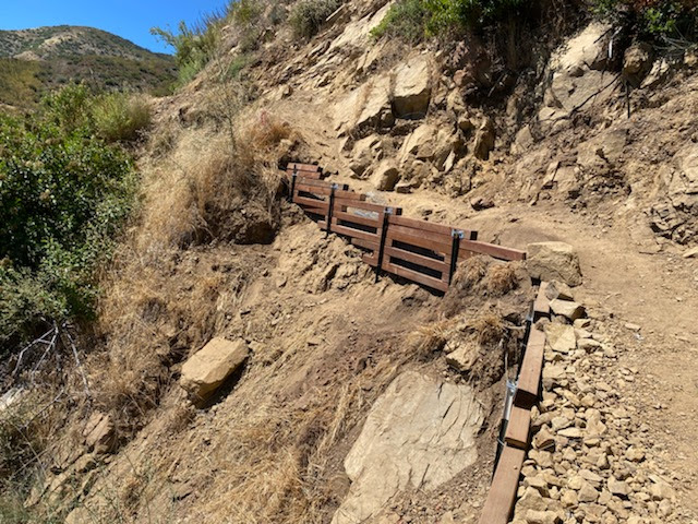 ••• The Montecito Trails Foundation emailed out an update on various trail-work projects, including the upper San Ysidro Trail: “We continue to carefully and thoughtfully make our way through the last major restoration project on San Ysidro. The lovingly dubbed Psycho Slide is looking a lot less Psycho these days. If you have a new name for it, feel free to send it along! The next stage of this project will be the restoration of walls above and just below the Waterfall. If you frequent San Ysidro, you know how necessary these next stages are! We’re looking forward to seeing a transformation making those last 300 steps before the Waterfall much easier.” Below: before and after shots of the Psycho Slide.