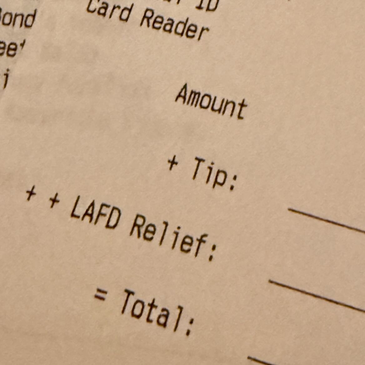 ••• I thought this donation line on the bill at a local restaurant was interesting, so I posted it on Instagram, along with a caption pointing out that it would be more meaningful if the restaurant was matching any amount. (I didn’t name the restaurant because my goal was not to shame it, so please don’t include it in a comment.) While I don’t doubt for one second the good intentions behind the donation line—and encourage everyone who can to donate to help those impacted by the fires—it struck me as virtue signaling without costing the restaurant anything; in fact, the cynical among us see the opportunity to shift the tax deduction from the donor to the restaurant. Most folks who replied agreed with me, but a few didn’t, which is certainly fine—it would just be great if we could have a conversation about complex matters without my being called “just another asshole with an opinion,” even if it’s true.