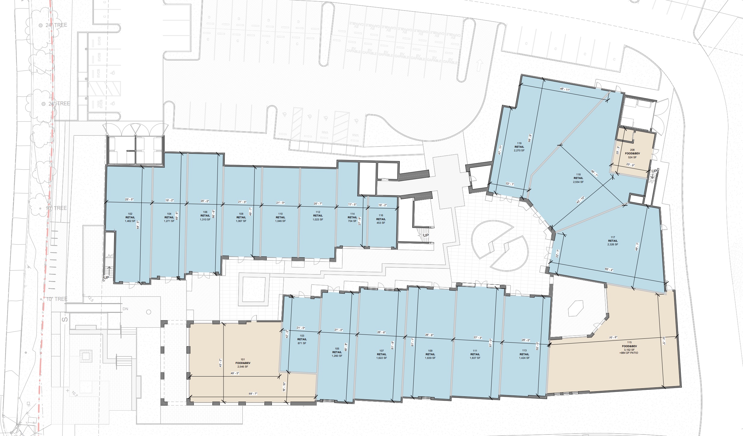 ••• According to the plans submitted in advance of the Historic Landmarks Commission’s January 29 agenda, the Runyon development at 301 E. Yanonali (at the northeast corner of Garden Street) will include 23 shops and, more pertinent to this post, four or five* restaurants, ranging in size from 527 square feet to 3,174 square feet. The project had previously been referred to as Platform Santa Barbara, as in a sister to Runyon’s Platform in Culver City, but that name doesn’t appear in the current plans, possibly because someone pointed out that the complex at 126 E. Haley Street—home to Renegade Wines, Organic Soup Kitchen, and others—is also called The Platform. Anyway, here’s a rendering (which doesn’t show the proposed trees) and the ground-floor and second-floor floor plans; the tan spaces are restaurants. (*A list in the plans includes five restaurants, but the floor plans only show four.)