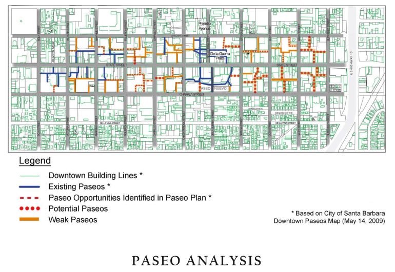 ••• “A vision for State Street emerged a bit clearer” when “a band of local architects presented sketches of three blocks, along with the creation of several paseos, during the State Street Advisory Committee meeting. […] The group showed color sketches for the 400, 800 and 1100 blocks.” The 400 and 800 sketches are below; 1100 is above. The drawings were not specific, and did not articulate whether vehicles, bikes or pedestrians would be allowed on the streets. [Architect Anthony] Grumbine said the sketches were not a specific design but a ‘design strategy’ and ‘toolkit’ for moving forward. The architects showed a fountain, trees, wide sidewalks, tents for a market, landscaping, art sculptures and other features designed to illustrate the area.” Nice stuff, but it seems like the car question really needs to be decided first. P.S. I included the architects’ slide about bolstering and improving the paseo network because I think it’s crucial. —Noozhawk