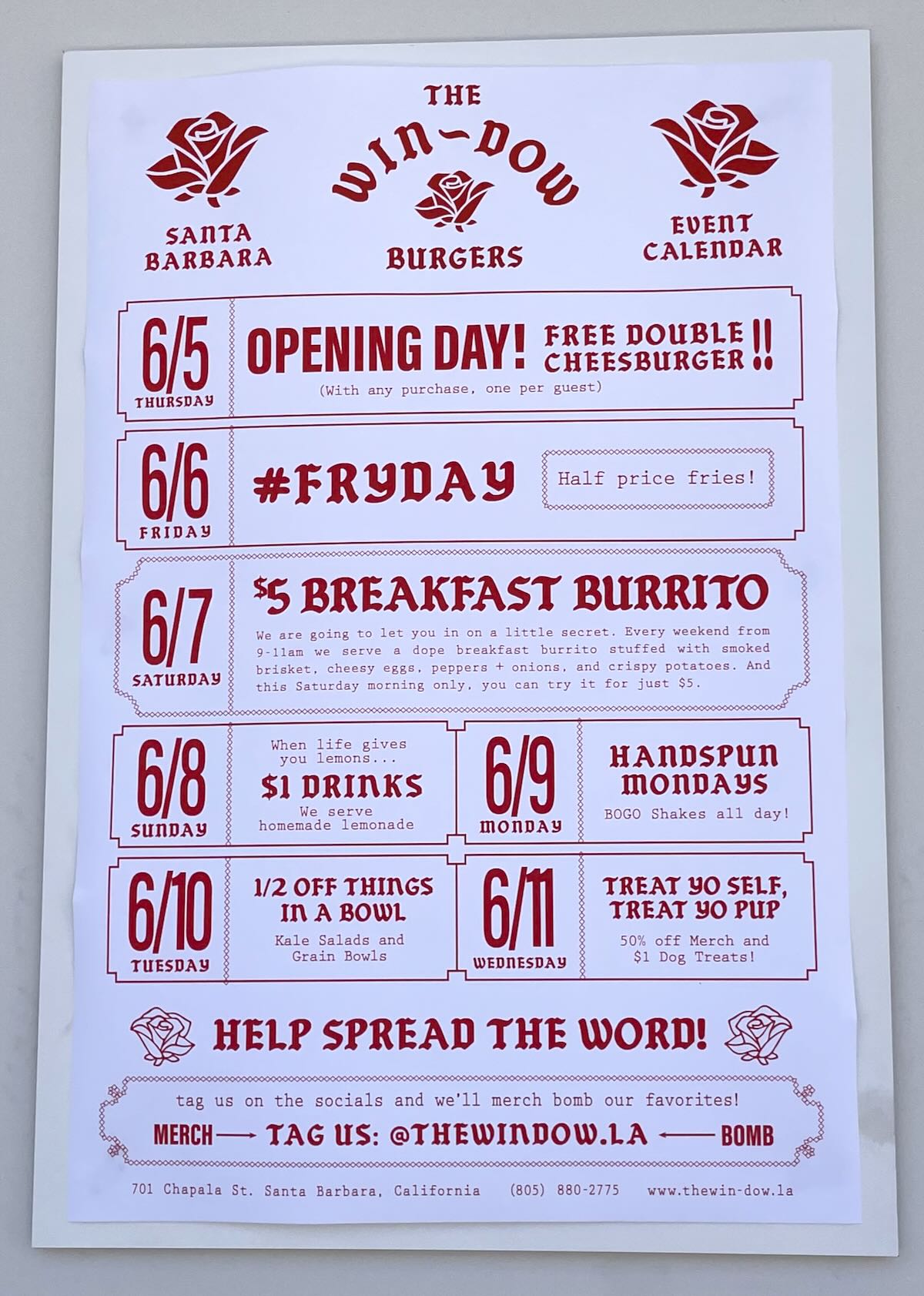 ••• The Santa Barbara outpost of L.A. burger chain The Win-Dow opens June 5 at the corner of Chapala and Ortega. A flyer explains some of the introductory specials. P.S. The renovation of the building diminished much of its charm.