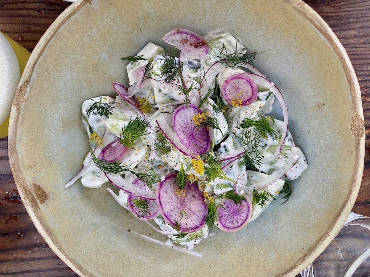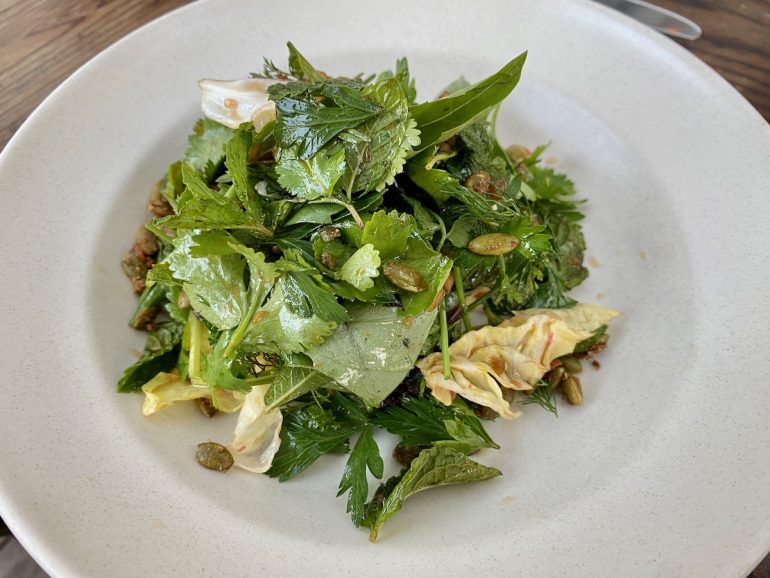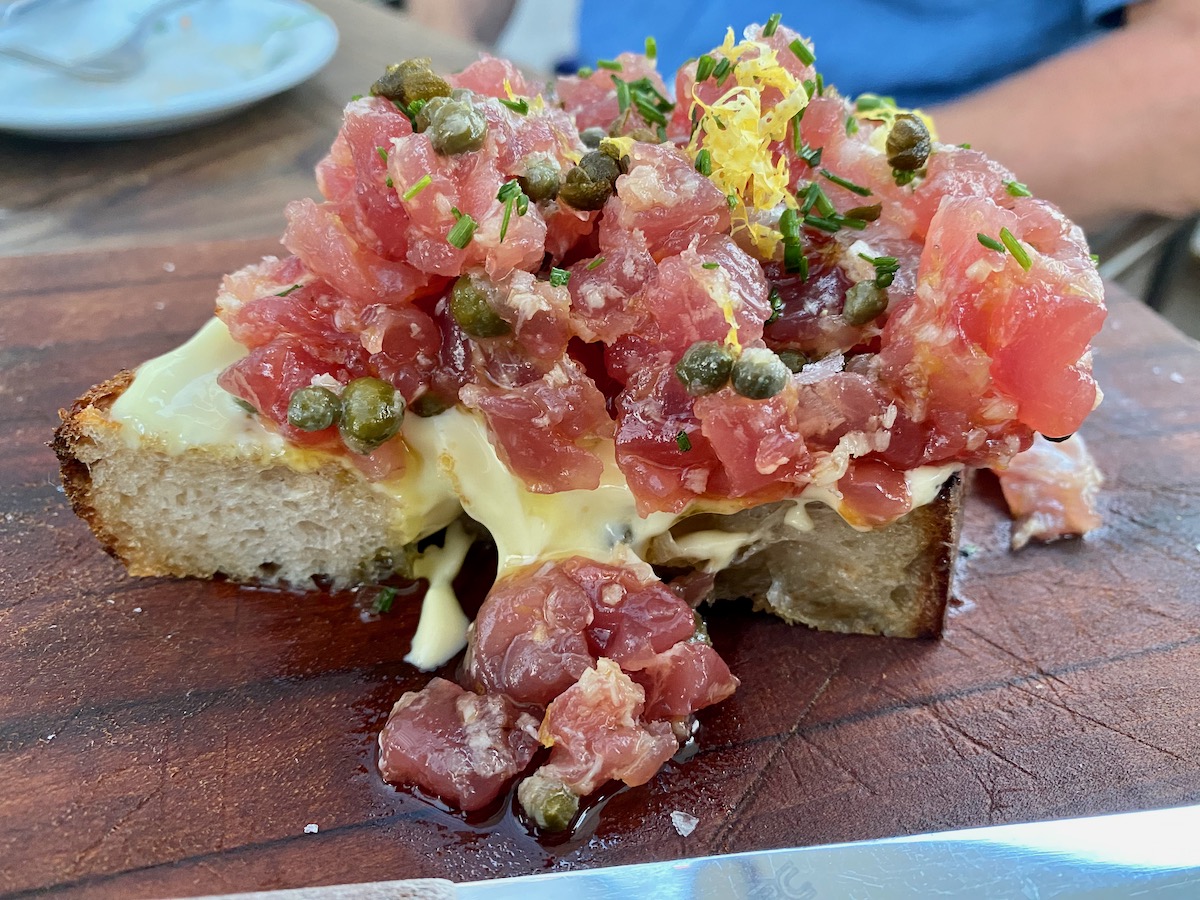 ••• Before Rory’s Place opened, I probably wrote about the Ojai restaurant more than anyone else—so I’m embarrassed to admit that I never got around to going, despite hearing good reports. (It’s only open for dinner.) Then one of Santa Barbara’s best chefs called Rory’s “a total gem” and said it was “my favorite meal I’ve had in the area in years.” Well, that did it. The food was indeed excellent; we particularly enjoyed the celery fizz cocktail, cucumber salad, herb salad, tuna tartare tartine, and the pork chop. (And the top-notch fries! At first I was a little peeved that they came out on their own, but then I decided it was more important that they were hot and crispy.) The dining room is loud, so if that’s a concern, reserve a table on the broad back terrace. And you might want to dress: the crowd was unlike any you see in Santa Barbara; it was as if a convention of L.A. gallerists was in town. There was edgy eye makeup, there was a patron clearly recovering from a facelift, and—in a first for me—there was the guy next to us, who BYO-ed a tablecloth and vase of flowers.