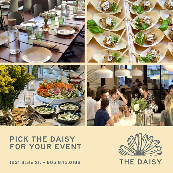 Right in the heart of Downtown Santa Barbara, across from the Granada Theater, The Daisy Restaurant is ready to host your event—large or small. Our beautiful, clean and modern interior—light and bright in the daytime, candlelit and cozy at night—can accommodate a small birthday party on our covered and heated patio or you can take the whole space (up to 150 people indoors). We serve super fresh, organic California cuisine, have 16 wines on tap, and are happy to design a special menu for your event. Contact [email protected] for details.