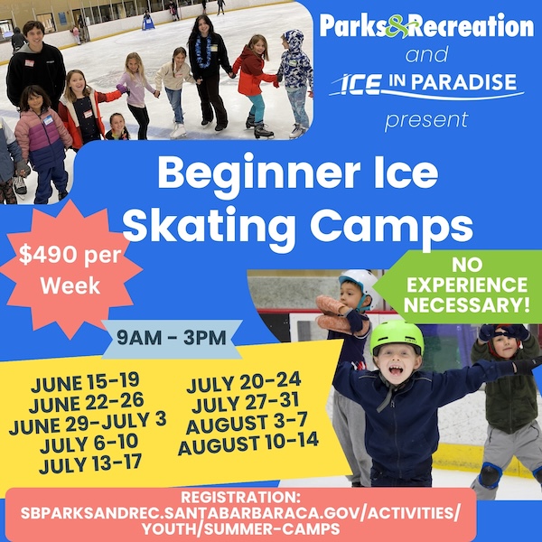 Pick up a new skill or further develop your existing passion with Ice in Paradise and Santa Barbara Parks & Rec through our ice skating camp! Designed for ages 5–12 and open to all skill levels, these full-day camps (9 a.m.-3 p.m.) combine skating instruction with fun both on and off the ice. Campers enjoy 3-4 hours of daily skating, professional coaching, off-ice activities, games, and arts & crafts. Skaters are grouped by age and ability within their lessons, so beginners and experienced skaters alike can build confidence and improve skills, while making new friends during open skate and play times. With week-long sessions available from mid-June through mid-August, families can choose the schedule that works best. Enjoy a perfect blend of learning and summer fun at Ice in Paradise.