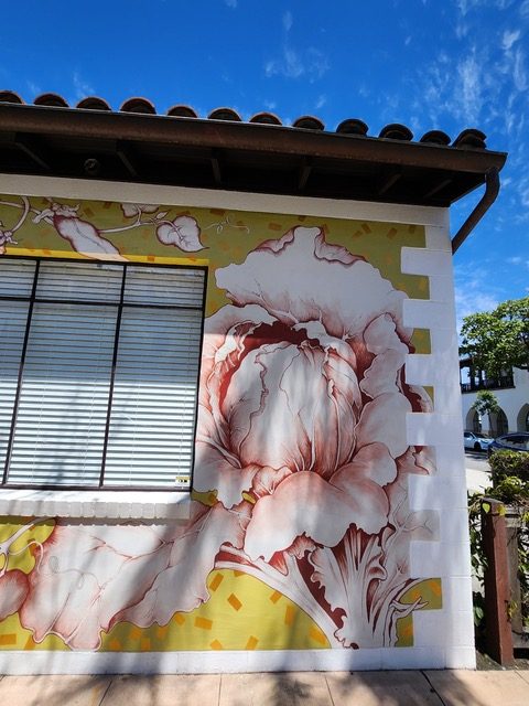 The clients are so wonderful! I had painted at their home several years ago, in Sycamore Canyon, where I did a cabaña, and out of the blue they asked me to do this side of their office building after they had done such a lovely design refreshment to an old radiator shop. It is their main office for their business, Western Pacific Produce. They are produce distributors. I was given complete freedom to do “anything.” I loved that they wanted to be sensitive to the condominium folks who would face it into the future… and I proposed a kind of classical drawing, to actually do a “botanical” of produce, inspired by vintage seed packets. I hand-transferred my drawing to the wall with pencil and then drew it all with fine-tip oil marking pen(s). It was amazing to work in public and have conversations and experience people’s responses.