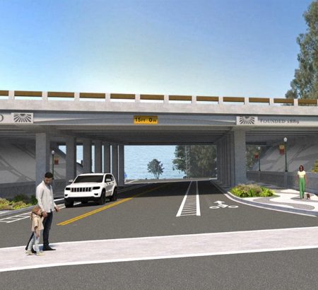 You’ll get a better understanding of the Evans undercrossing, with its zippy design reminiscent of Copacabana; the Sheffield Drive righthand on- and off-ramps; and sound walls that include planters.