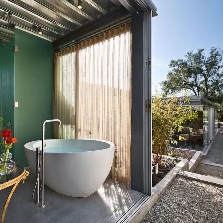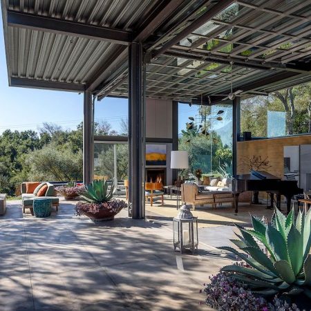 Steel and glass are the primary materials listed for the Barton Myers–designed house at 770 Ladera Lane, but the ones that first come to mind are light and air.