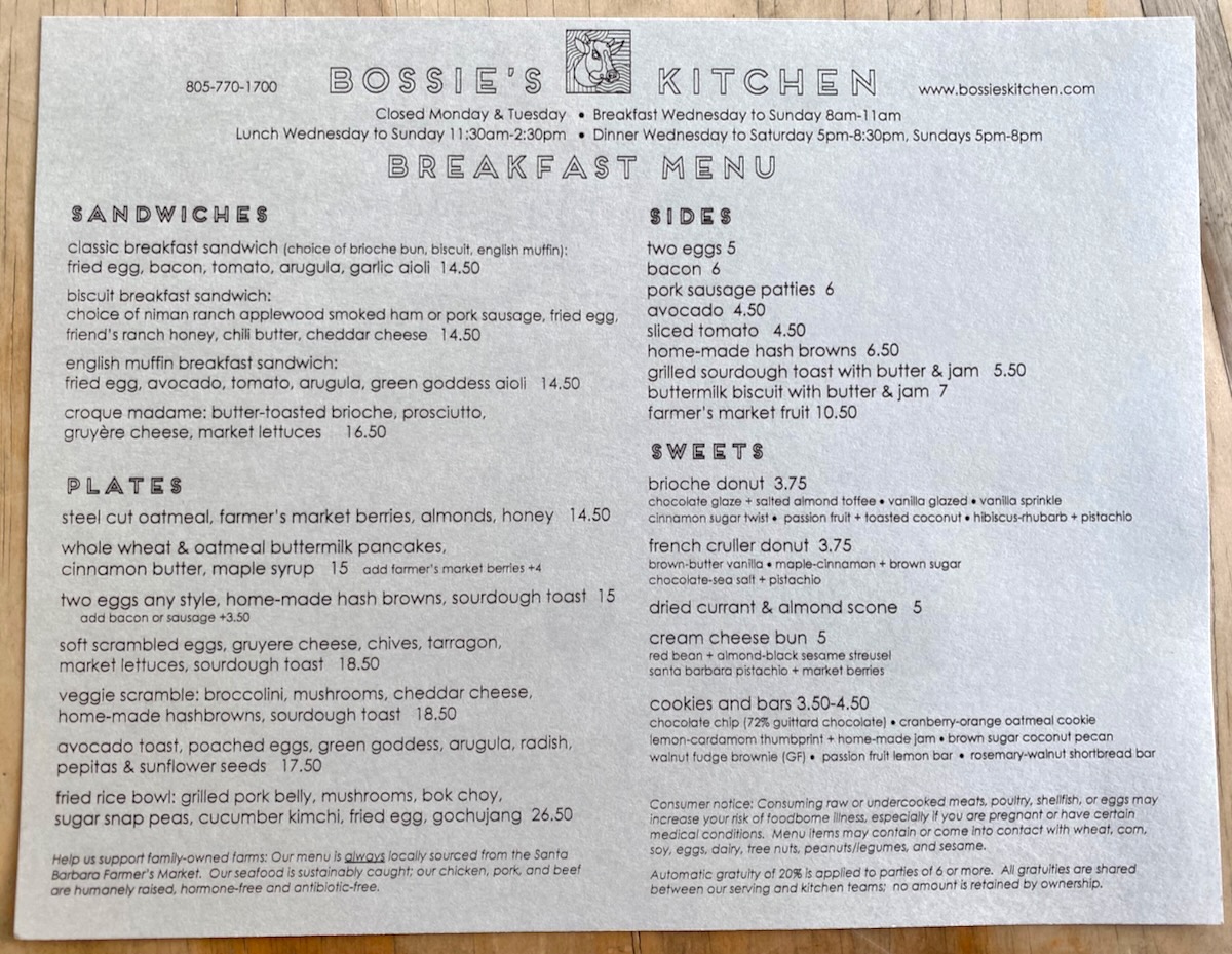 ••• Bossie’s Kitchen is now serving breakfast, Wednesday through Sunday, 8 a.m. to 11 a.m., and the menu is full of tempting items. I rushed over to try the classic breakfast sandwich on a homemade English muffin, and I quite enjoyed it, but the biggest news here might be that you can finally get Bossie’s famous donuts in the morning.