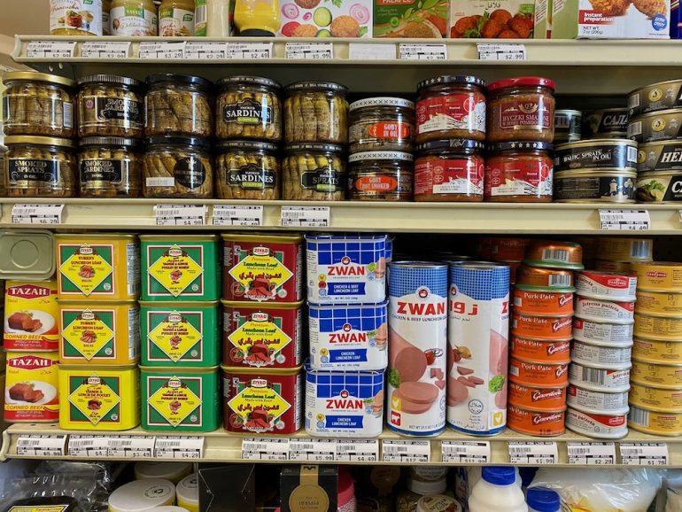 ••• I was noodling around Google Maps, thinking about a walk somewhere new, when I saw the European Deli & Market, which I had never heard of. It’s on Hollister Avenue, just west of Modoc (and there’s parking behind the building but the entrance to the one-way driveway is on the west side of the building). As someone who gets extremely excited about new food, I was in heaven. The store has the kind of stuff you only see in markets in Europe and the Middle East. Because I’m not allowed to buy more food right now (we’re trying to empty our pantry in advance of a move), I only bought one thing—halloumi, which is hard to find around here unless you’re OK with it being covered in dried herbs. Once we’re settled in, I’ll be back for the pickles (including the turnips and cherry tomatoes), for sure, and sauerkraut, and pierogis, and who knows what else…. Well, not the canned meat.